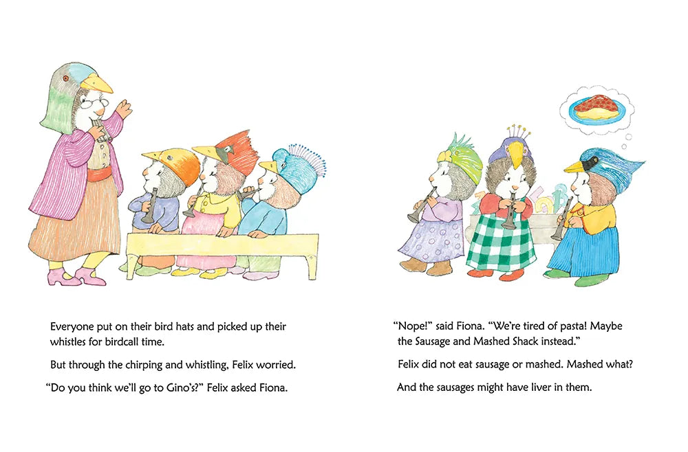 Felix brings the same lunch to school every day: sprouts on buttered oat bread. He will also eat pasta with butter. And he loves macaroni and cheese. No need to try anything new. But on the night of his friend Fiona’s half-birthday celebration, Felix finds himself facing down an unfamiliar – and anxiety-provoking – menu. Will he leave the restaurant hungry, or can Fiona convince him to give new tastes a try?