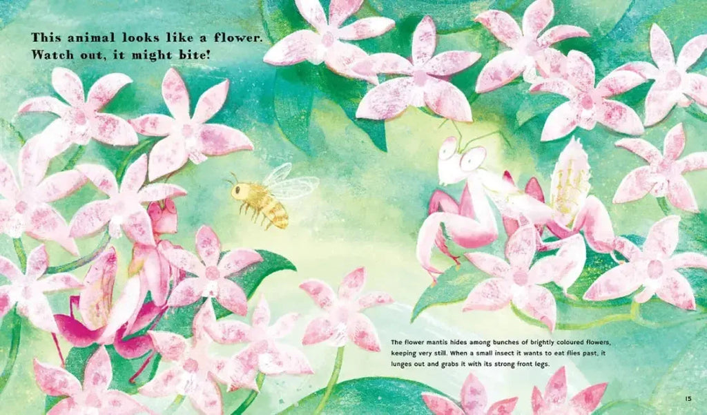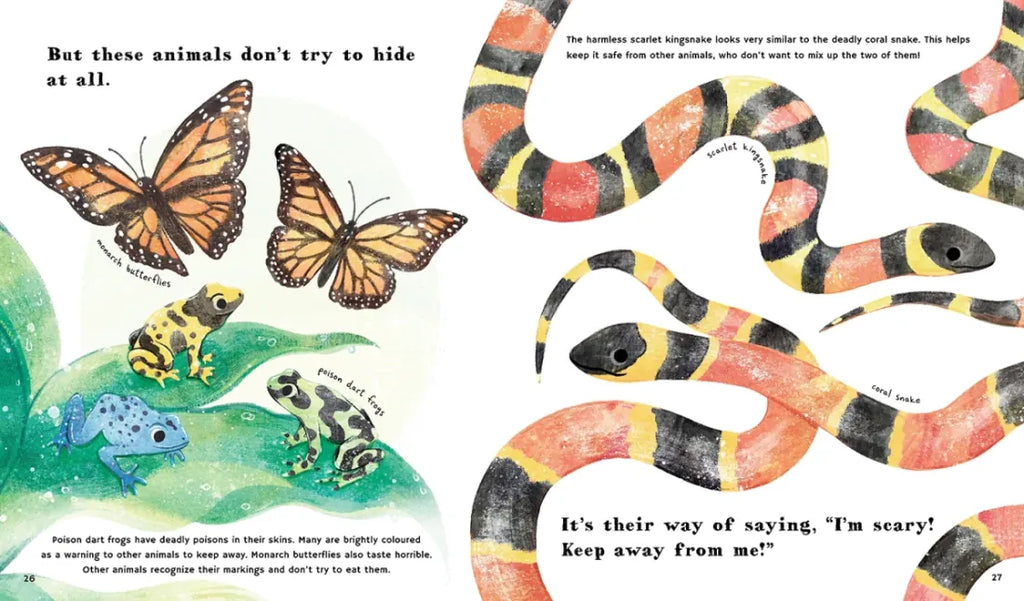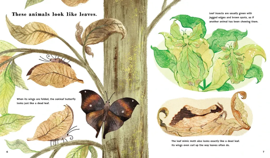Some animals hide in the sand, like the desert lizard, whose scales can resemble pebbles and stones. Others hide in the sea, like the peacock flounder, who can also change color. And some, like poison dart frogs and the scarlet king snake, don’t try to hide at all! Most animals have developed clever tricks to survive, but not all excel at camouflage the way these animals do. From moths whose wings resemble dead leaves to eponymous stick insects, from a lizard that looks like a tree stump to the ghost pipefish you’d mistake for a coral reef, the range of colors, patterns, and techniques captured here demonstrates how animals across myriad environments can disguise themselves. Melding a simple narration with more detailed facts on a variety of creatures—including sandgrouses, gerbils, Arctic foxes, and butterflies—this fascinating picture book also offers a brief note on animal camouflage in the back matter.