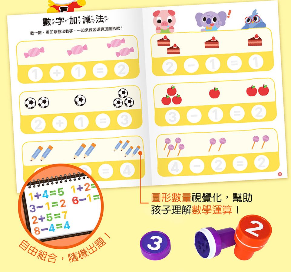 這本書提供了多種有趣的玩法,讓孩子在蓋章的過程中學習不同的色彩和數字學習,從1-10認知到錢幣算數。透過印章遊戲,可以幫助孩子平衡左右腦的發展,培養創意力、小肌肉發展和數字認知能力。 本書內附有可愛的4個FOOD超人獎勵印章、16個數字印章與4個錢幣印章,設計上採用了分離式印章盒,方便輕鬆收納整理