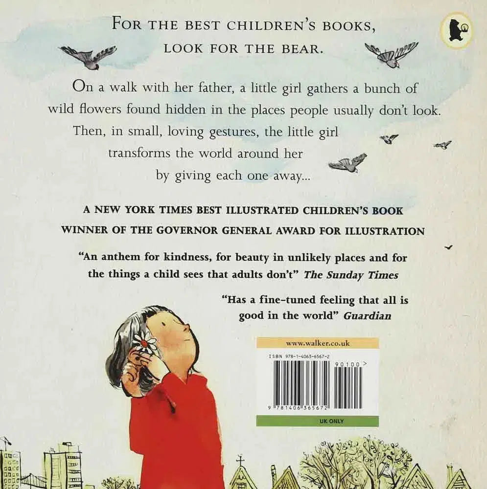 In this wordless, beautifully illustrated picture book from award-winning poet JonArno Lawson, a little girl collects wild flowers while her distracted father pays her – and their surroundings – little attention. Each flower the little girl gathers becomes a gift for a person or animal, and whether the gift is noticed or ignored, both giver and recipient are transformed by their encounter. An ode to the importance of small things, small people and small gestures, Footpath Flowers is a quiet but powerful testament to the joy that children can find in ordinary things and the mutual value of giving.
