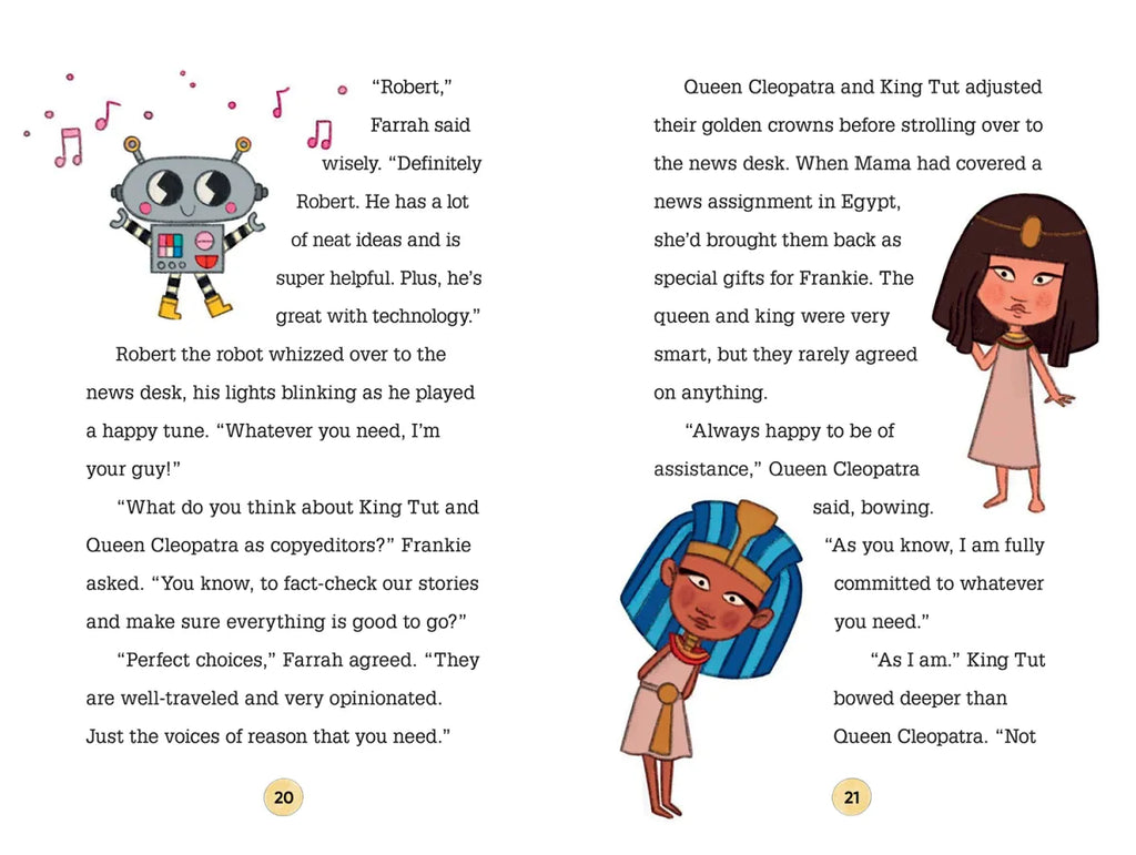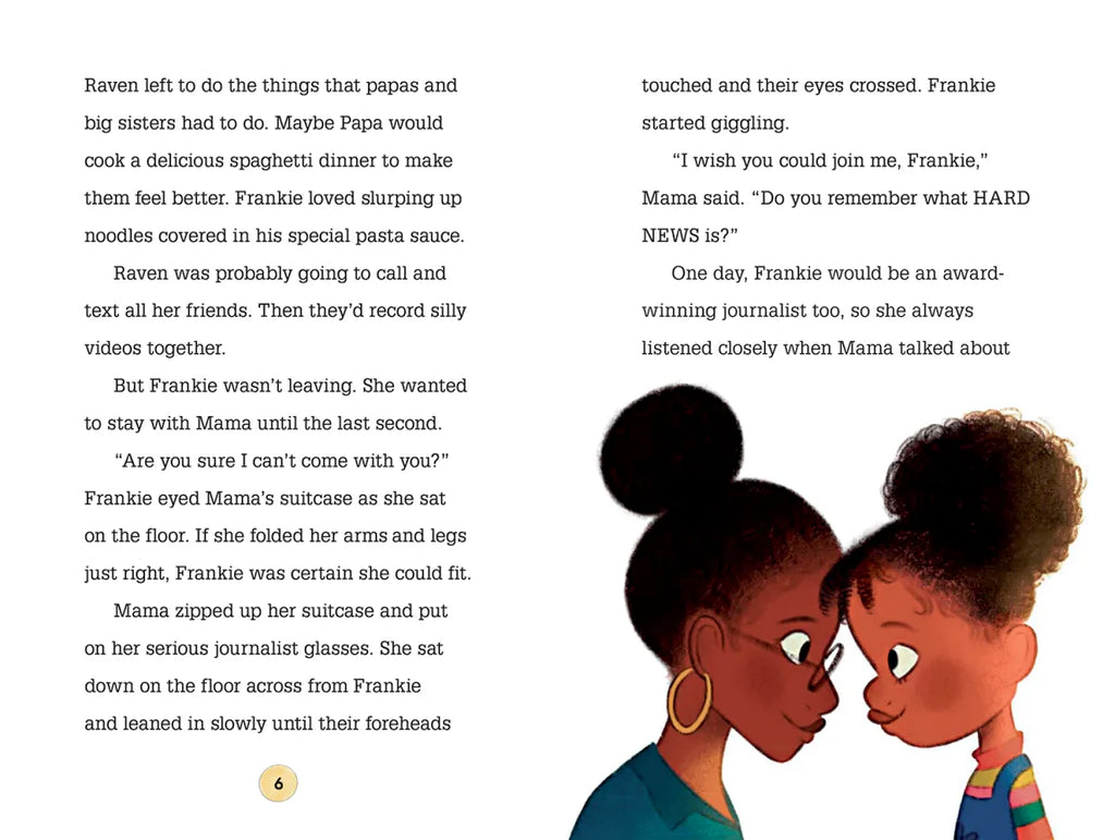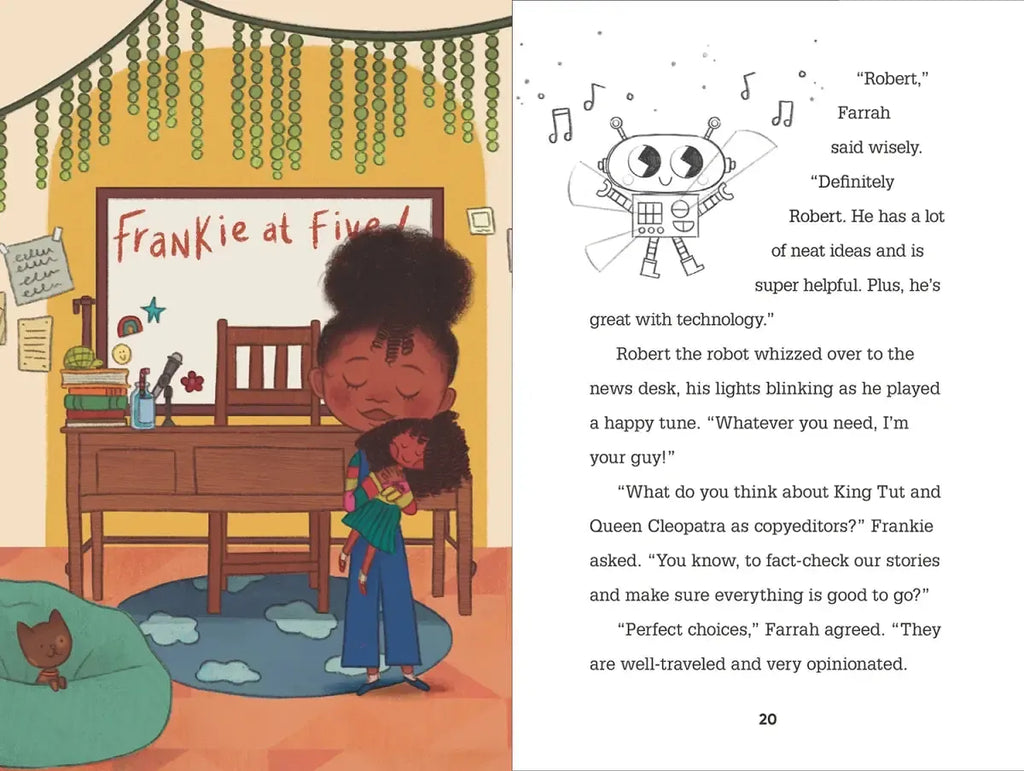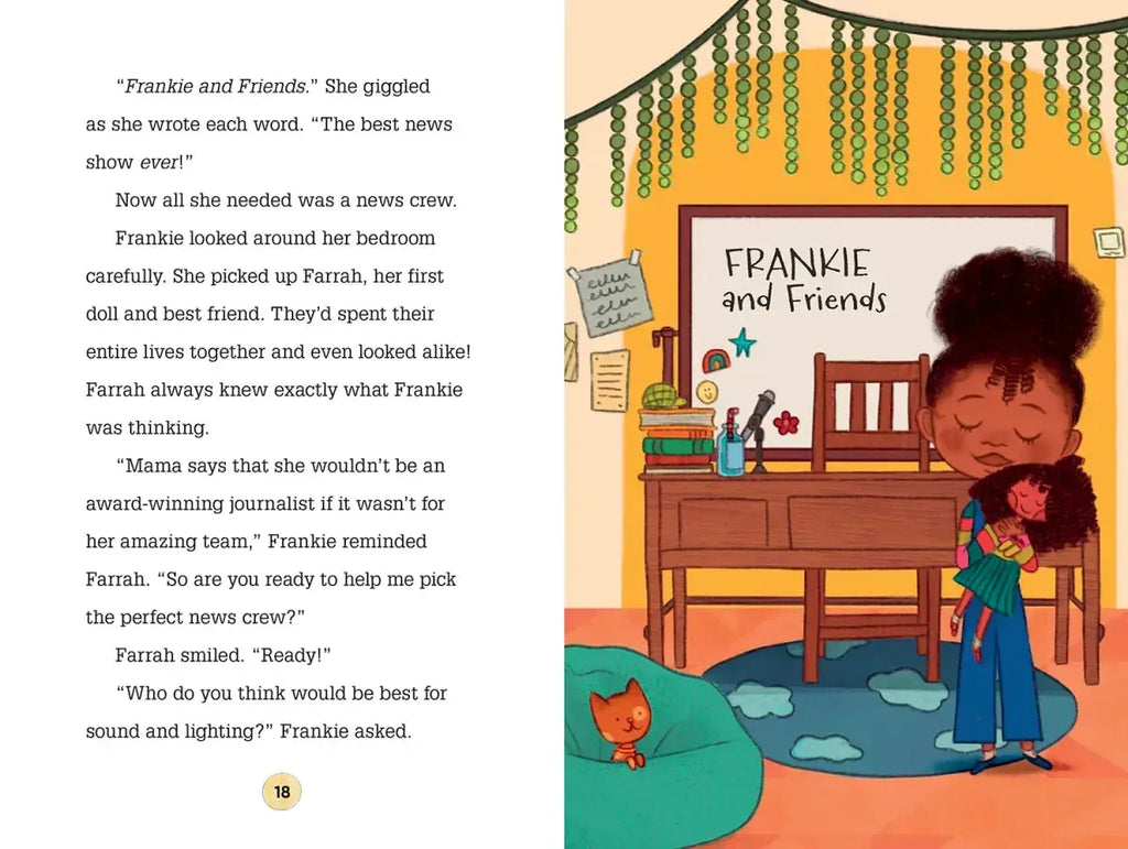 Frankie’s mama is leaving to cover a breaking news story. Frankie, Papa and Frankie’s teenage sister, Raven, are all proud of Mama, even though they miss her when she’s away. But Frankie has a great idea: she can make her own news show! After all, Mama has told her that news is happening around her all the time. With a little assistance from her friends – including her doll Farrah, Robert the toy robot, and her tabby cat, Nina Simone – Frankie prepares for her first “broadcast”. And when she hears someone crying in the house, she knows that’s the developing story she must cover.