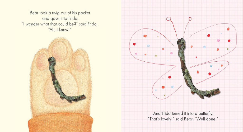 Frida and Bear love to draw. But what should they draw? First Frida draws a shape and gives it to Bear. “Try to turn this shape into something,” she says. Bear looks at the shape and adds a bit more, and now it’s a puppy! Then it’s Frida’s turn, and before they know it, they’ve drawn a big fish and a funny pig, a monkey from a scrap of wrapping paper, and a butterfly out of a twig. A simple idea spurs endless possibilities in a new winner from Anthony Browne and Hanne Bartholin.