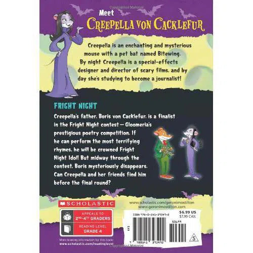 Creepella's father, Boris von Cacklefur, is a finalist in the Fright Night contest -- Gloomeria's prestigious poetry competition. If he can perform the most terrifying rhymes, he will be crowned Fright Night Idol! But midway through the contest, Boris mysteriously disappears. Can Creepella and her friends find him before the final round?