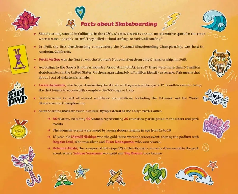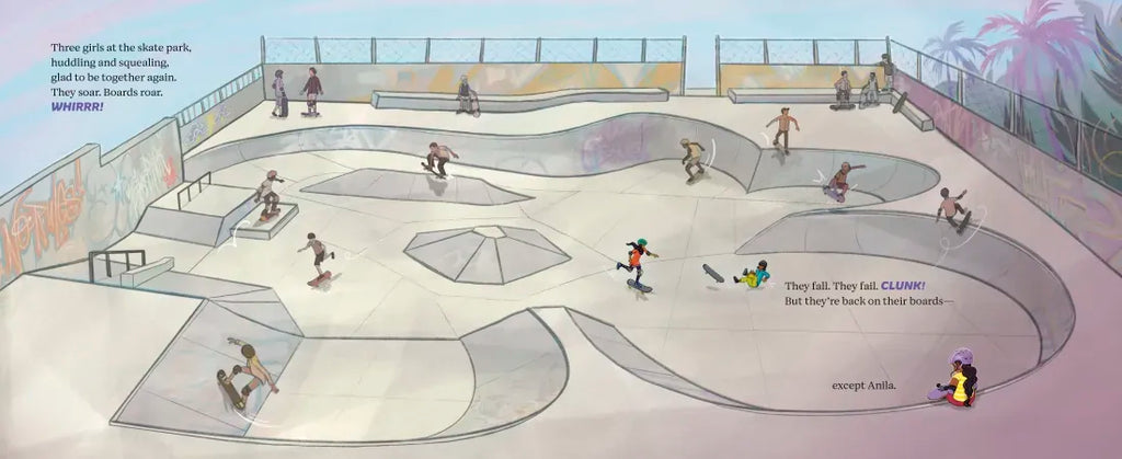 Anila is on her way to her favorite place: the skate park. She longs to glide on her board and feel the thrill of catching air. But when she arrives, the ramp looks like a concrete sea monster! Fear creeps in, making her once-broken arm ache. But Sana’s smile and Damini’s laugh wrap Anila in courage. Her friends remind her that in skateboarding, sometimes you fall—but sometimes you fly!