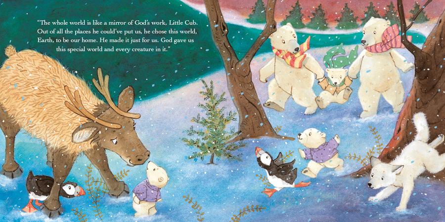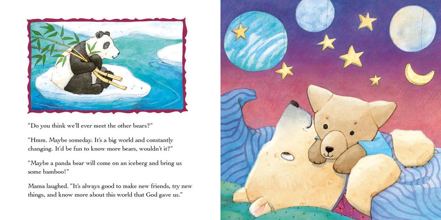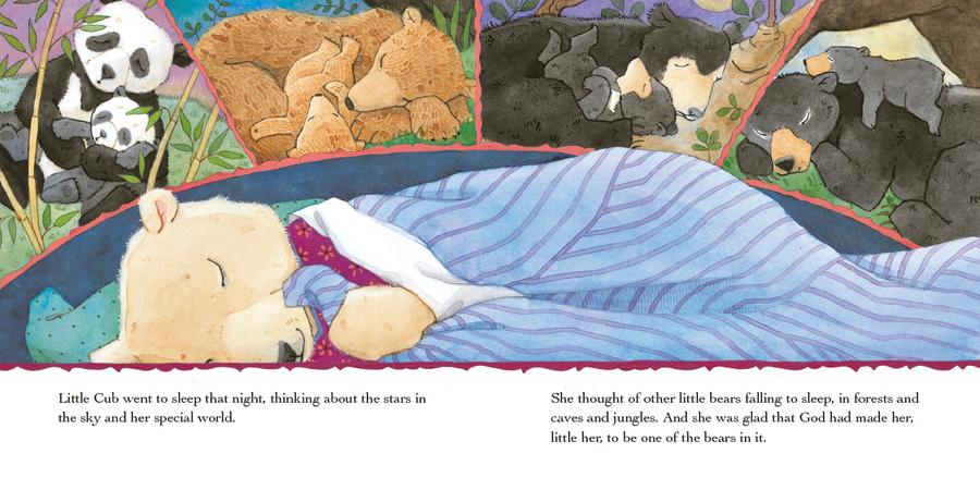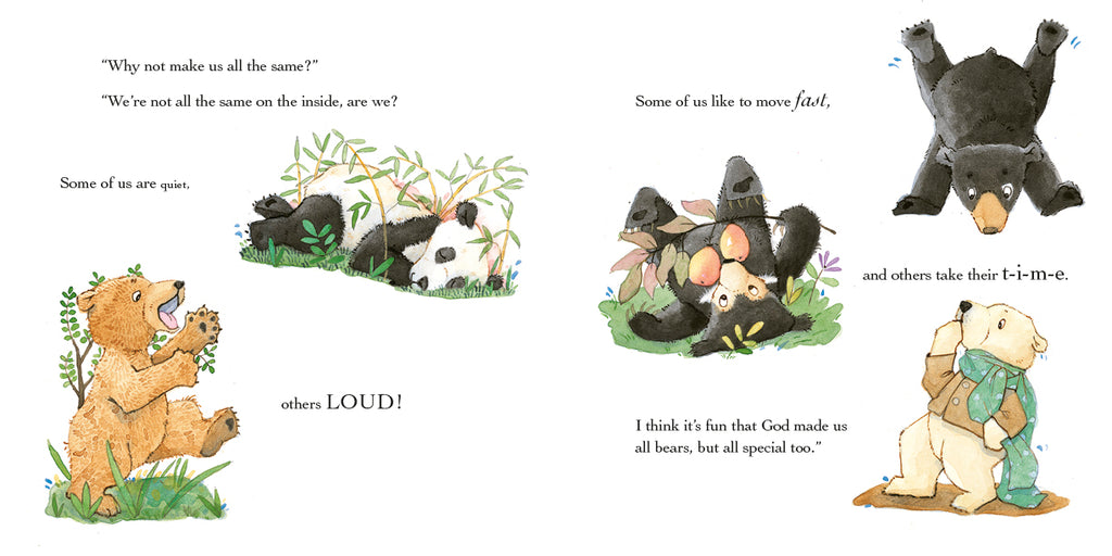 Little Cub’s trip to a special museum exhibit, “Bears Around the World,” sparks a flurry of questions from the young polar bear who is just beginning to learn about life beyond her North Pole home. As Mama Bear shares with her about the different types of places that God has put the various types of bears, with their different kinds of fur and food, Little Cub begins to wonder: Why didn’t God make us all the same?