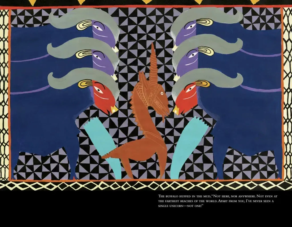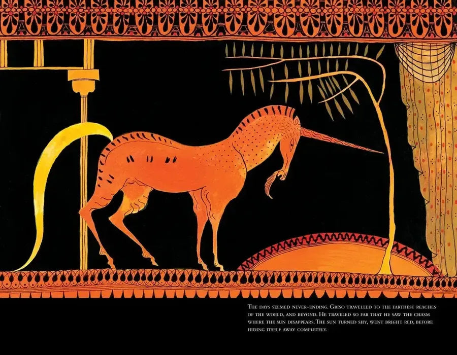 The last of his kind, Griso travels the world searching for unicorn companions. He asks beetles, chameleons, and buffalos if they’ve seen any mythical creatures like him, and all send him on his way saying, “Neither here nor at the edge of the world.” Griso gallops across plains, marshes, and mountains, he trots into the sunset and chats with fearsome narwals by the sea. On each spread, we see Griso rendered in a new artistic style, portrayed as a shadowy cave painting, a chivalrous medieval stead, or lost along a mind-bending surrealist horizon. Griso, the Unique introduces young readers to artistic movements spanning the 7th to 18th century, leaping across time and color with the flip of a page. In Daniel Hahn’s exquisite translation, Griso, the Unique opens the doors to a world of African painting, Tang Dynasty murals, medieval tapestries, and art hidden beneath Egyptian pyramids. A song of color, time, expression, and a fantastical search for belonging by Brazilian visionary, Roger Mello.