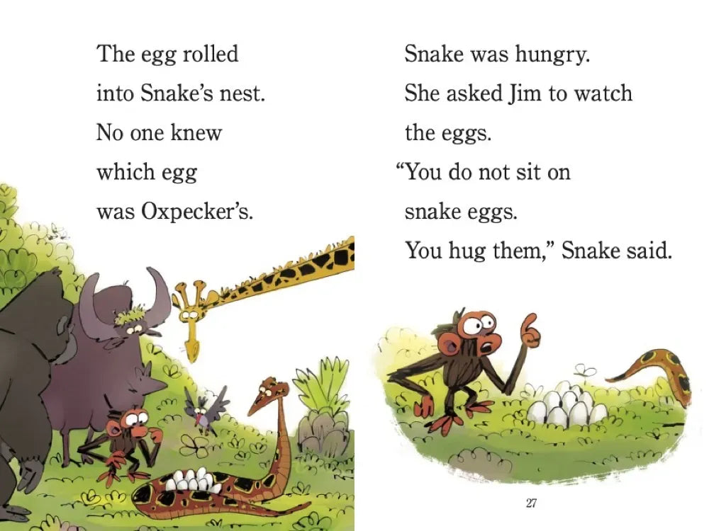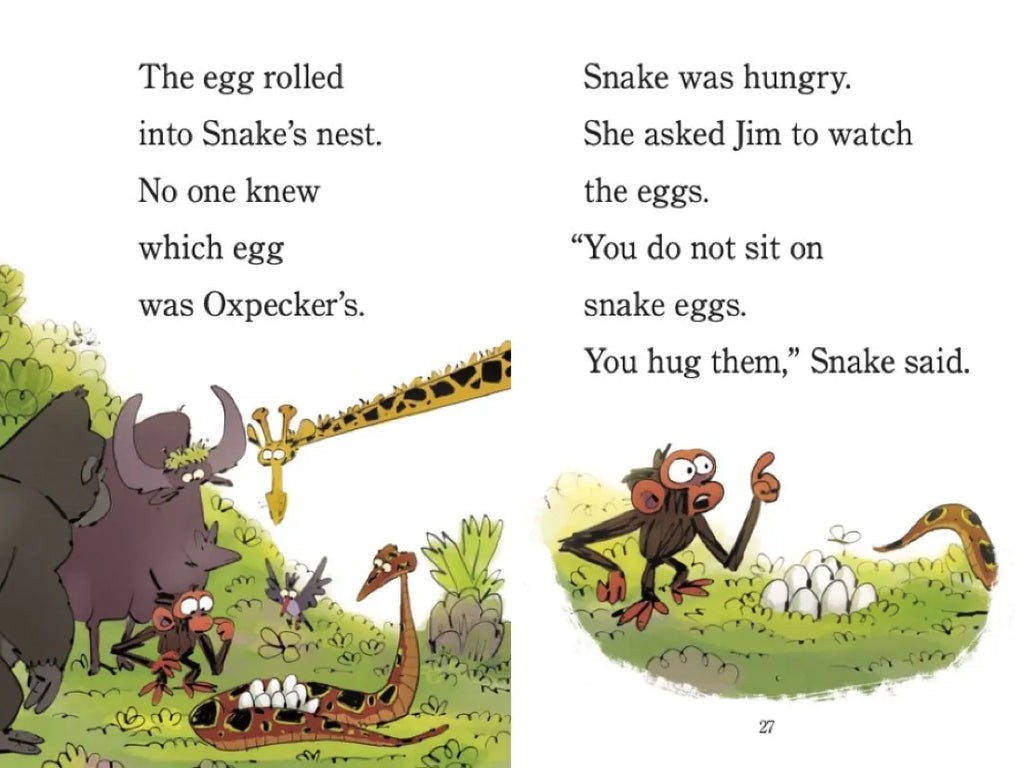 Jim wakes up to a perfect day and is ready to have fun. Instead, Oxpecker persuades Jim to sit on her egg for just a minute...and now she is nowhere to be found! Poor Jim is stuck being the egg-sitter. Then Norman suggests that the other jungle animals take turns, so everybody gets a chance to play. But when Jim, Norman, and Leslie take a lunch break, the troublesome egg rolls away. Jim runs after it, but the egg slips by him and ends up with the eggs in Snake's nest. When the snake eggs hatch, the baby snakes look right at Jim and cry "Mama!" Jim vows to never egg-sit again.