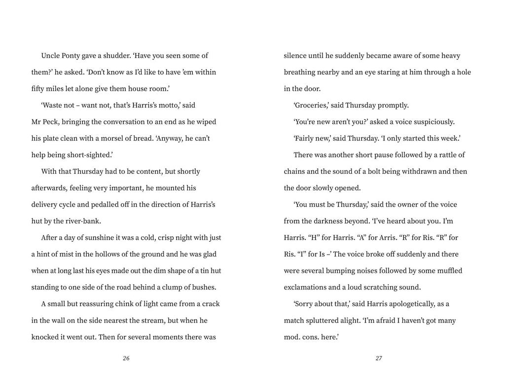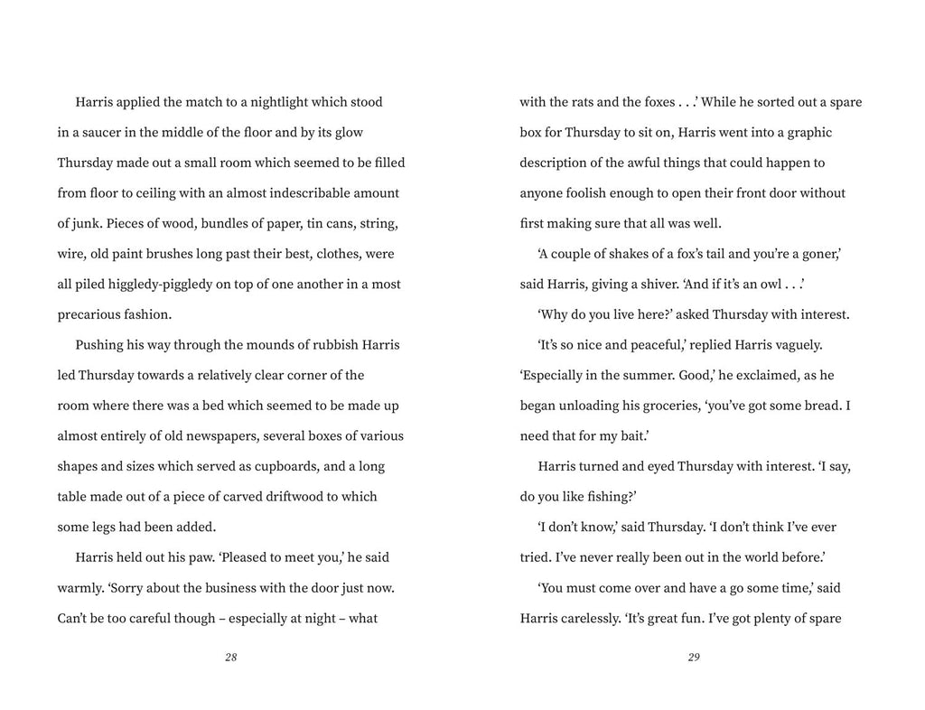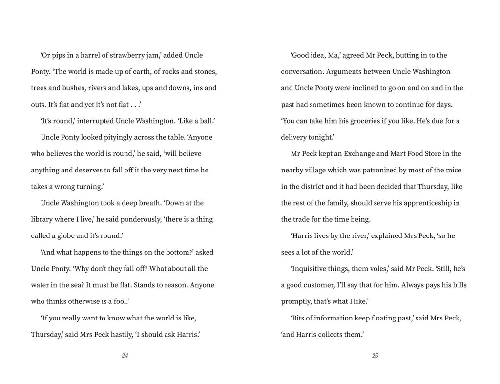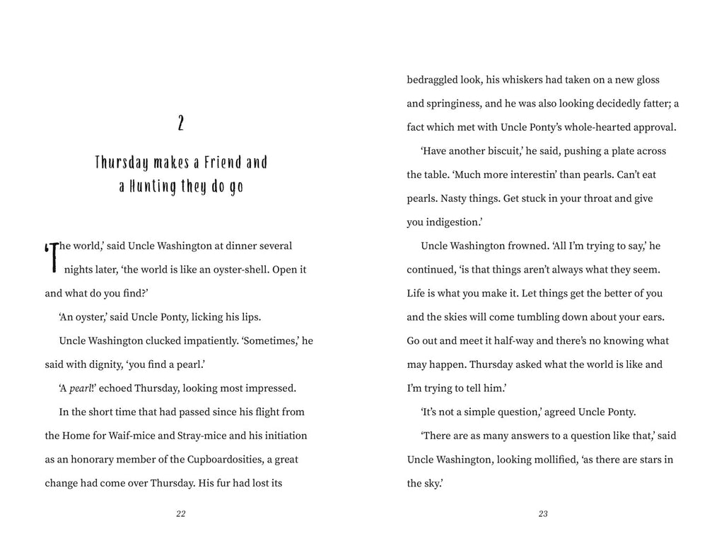 Thursday the Mouse fell from a balloon having just escaped from the Home for Waif-Mice and Stray-Mice. The Peck family of church mice adopt him and give him his name – Thursday – because the day he arrived was a Thursday to remember. Thursday joins the Pecks in their organ-loft home at the church of St Mary's in the Valley.
