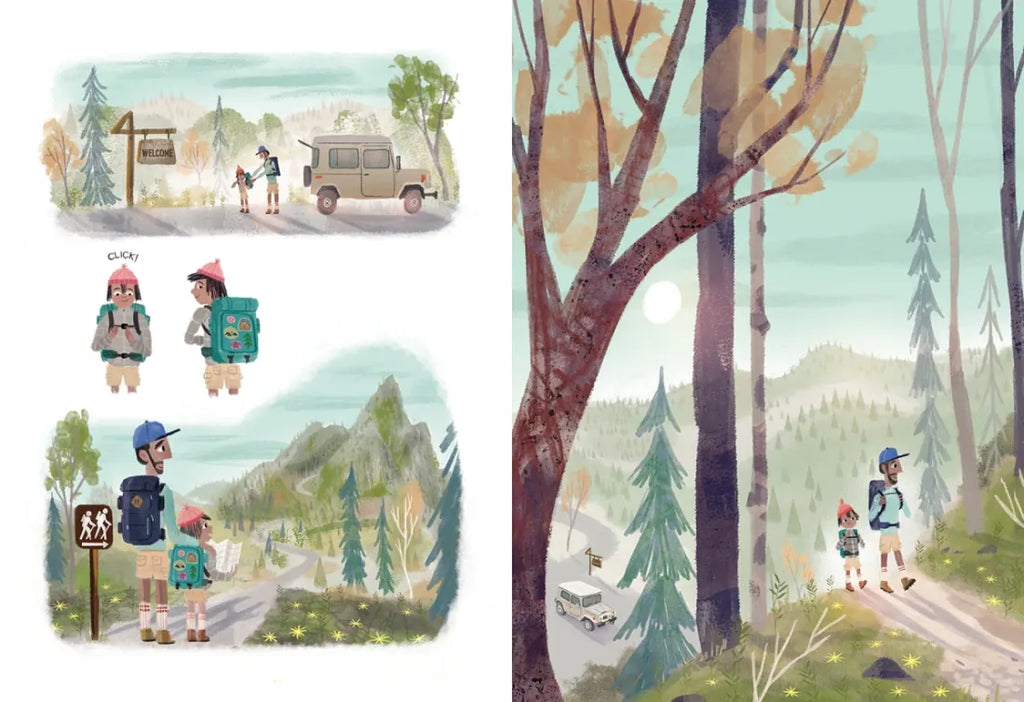 In the cool and quiet early light of morning, a father and child wake up. Today they’re going on a hike. Follow the duo into the mountains as they witness the magic of the wilderness, overcome challenges, and play a small role in the survival of the forest. By the time they return home, they feel alive — and closer than ever — as they document their hike and take their place in family history. In detail-rich panels and textured panoramas, Pete Oswald perfectly paces this nearly wordless adventure, allowing readers to pause for subtle wonders and marvel at the views. A touching tribute to the bond between father and child, with resonant themes for Earth Day, Hike is a breath of fresh air.