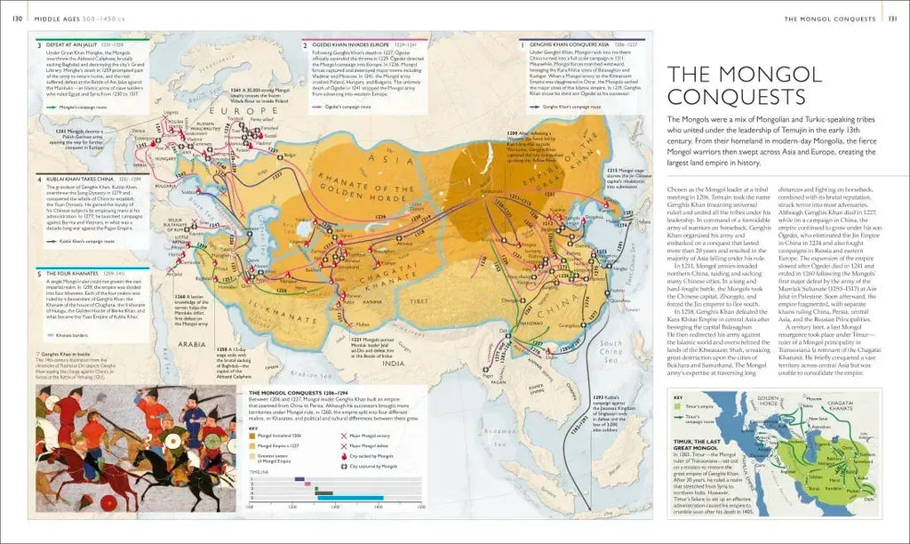 This stunning history book for adults starts with the evolution and migration of our oldest ancestors out of Africa. You can then look up maps about the Greece and Persian War, the Mongol Conquests, Medieval Europe's trade routes, and the rise of the Ottomans. Explore maps about the colonisation of North America, the scientific revolution, Napoleon's advances, and Britain's control of India. Then uncover the history of later centuries, such as the Age of Imperialism, the American Civil War, industrialised Europe and the transformation of Japan.