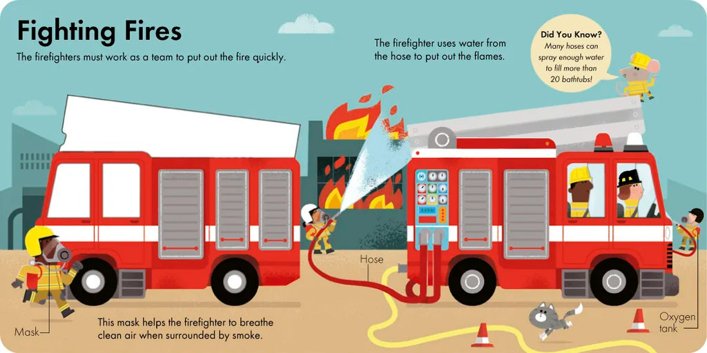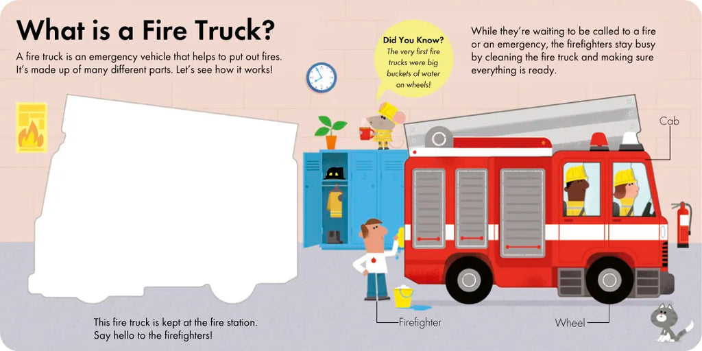 This interactive book features layered die-cut pages throughout to introduce toddlers to fire trucks and how they work.