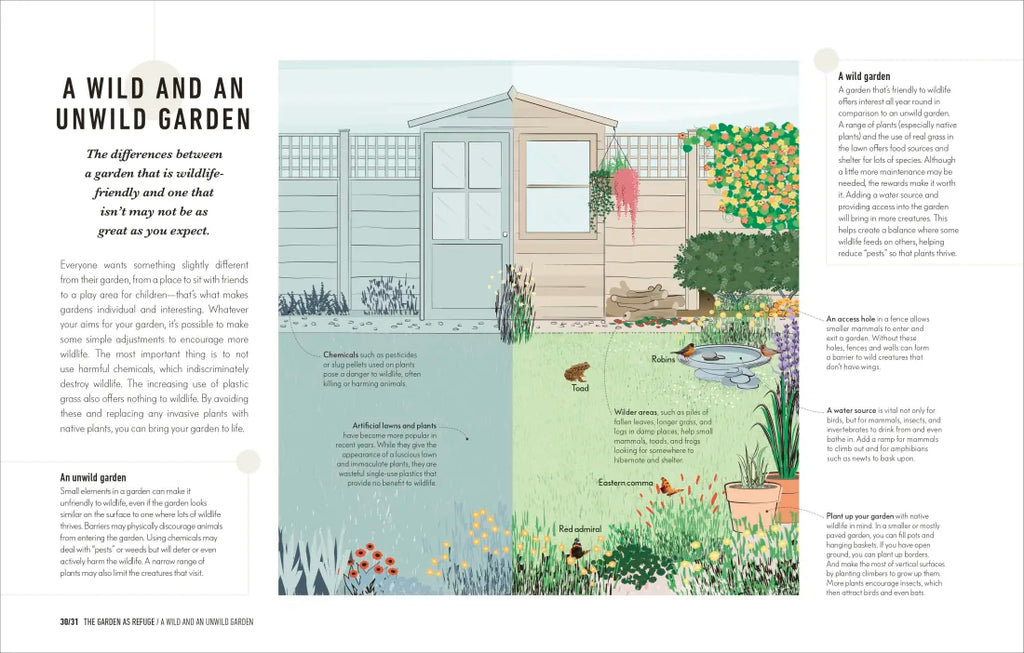 - Ideas for small gardens and outdoor spaces, as well as practical considerations such as pets and children sharing a garden with wildlife.