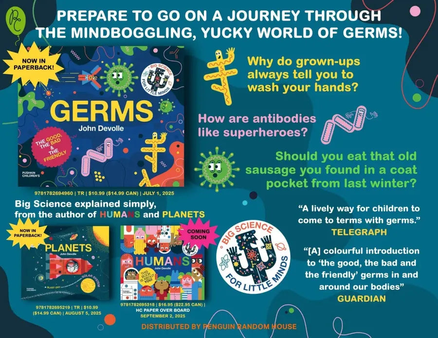 Humans is the fifth book in the widely acclaimed Big Science for Little Minds series, written and illustrated by John Devolle. Previously, readers have learnt about atoms, brains, germs and planets – now it’s time to learn about what makes the human race so different to other species.