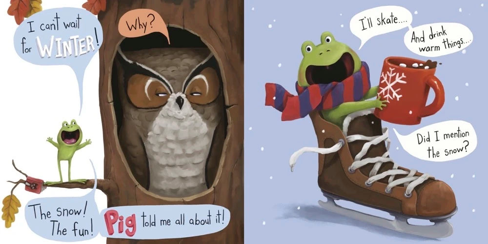 Frog is excited about autumn and the coming of winter. But when Owl informs him that frogs hibernate till spring, Frog is upset at missing out on all the snowy fun. In this hysterically funny twist on the classic "I don't want to go to bed" dilemma, Frog comes up with all kinds of reasons why he's not going to sleep through winter, until he devises a clever way to convince his friends to come along for the ride.
