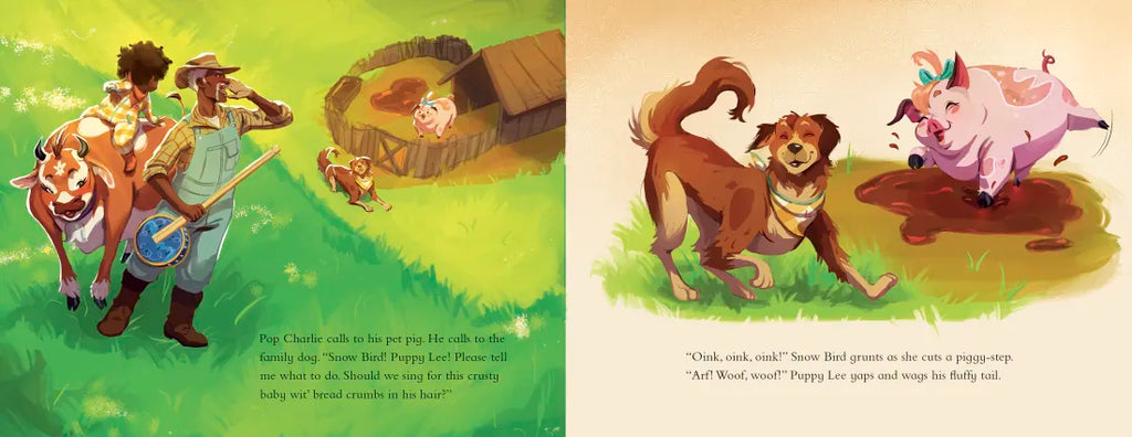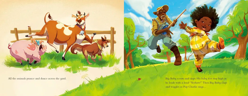 Hezekiah Big Baby Jenkins runs from the breakfast table to the farmyard begging Pop Charlie to sing. As he plucks his diddley bow, Pop Charlie smiles and invites the animals and Big Baby to join in the music.