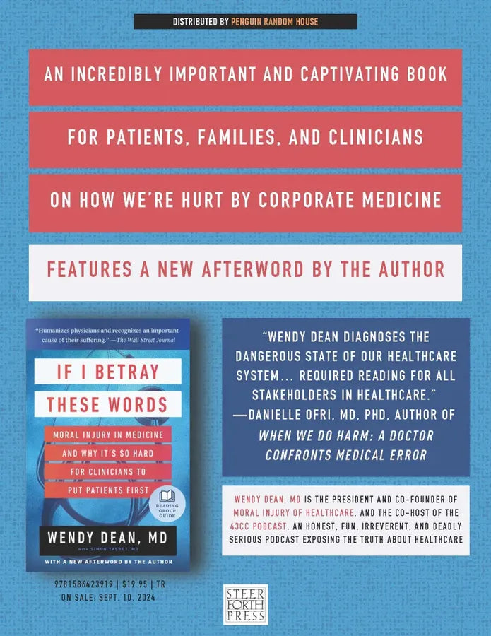 “Wendy Dean diagnoses the dangerous state of our healthcare system, illustrating the thumbscrews applied to medical professionals by their corporate overlords… Required reading for all stakeholders in healthcare.” — Danielle Ofri, MD, PhD, author of When We Do Harm: A Doctor Confronts Medical Error