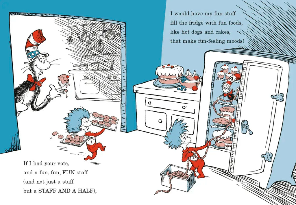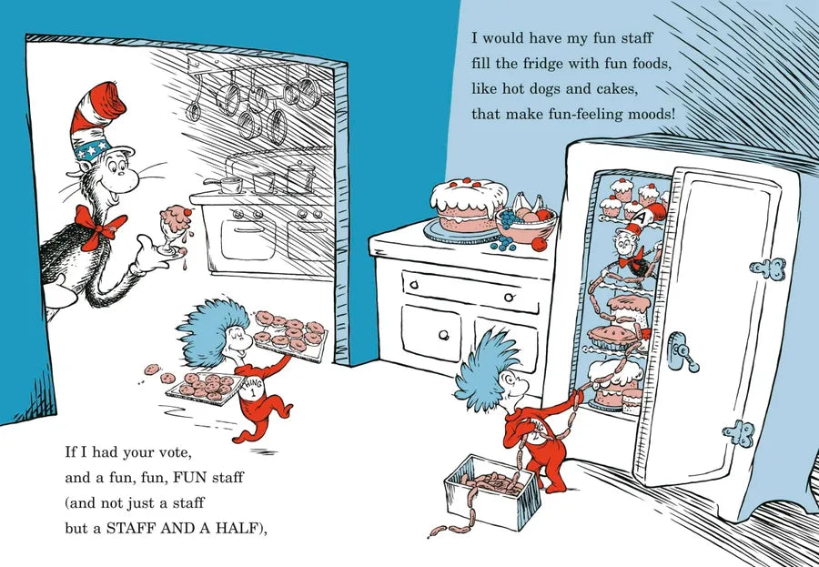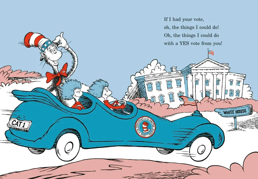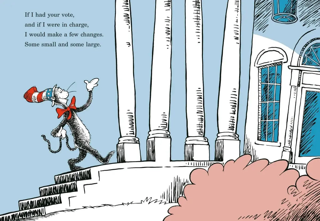 Think politics is boring for kids? Think again! If the Cat in the Hat is elected president, life in the White House is about to get a lot more interesting—and funny! The Cat plans to shake things up. On his agenda: To change the shape of the Oval Office (to make it far more OVAL-ER-ER); to replant the Rose Garden with Seussian shrubbery; to paint smiles on portraits of frowning world leaders; and (among other things) to shoot a SOCK-IT rocket into space to shower the United States with an explosion of socks! Written in rhyme and featuring a cast of characters from The Cat in the Hat and The Cat in the Hat Comes Back, this is the perfect, kid-friendly way to introduce beginning readers to life in the White House AND to the Cat in the Hat.