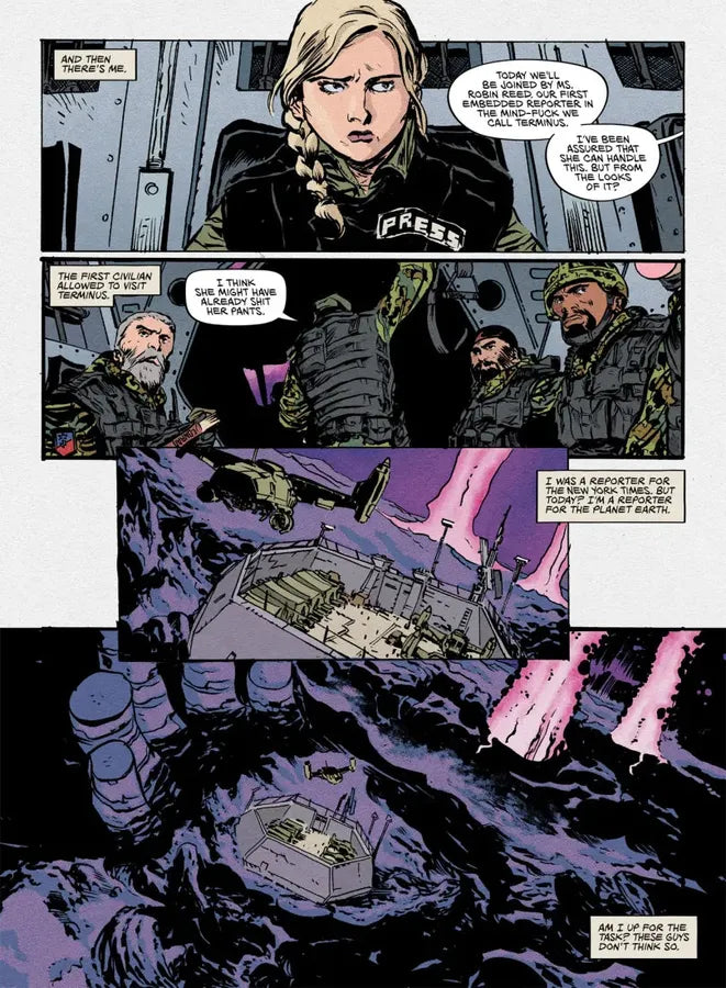 Robin is a big city reporter, embedded with US Marines heading to the hostile pocket universe called Terminus. Ten minutes in, the entire marine squad is wiped out and she has to survive (and report) on her own. Terminus is full of cosmic wonders—and sci-fi “gods” that are in the middle of a political power struggle. The language is alien, and the politics are deadly. Can she survive long enough to figure out what’s going on and get home to tell the story?