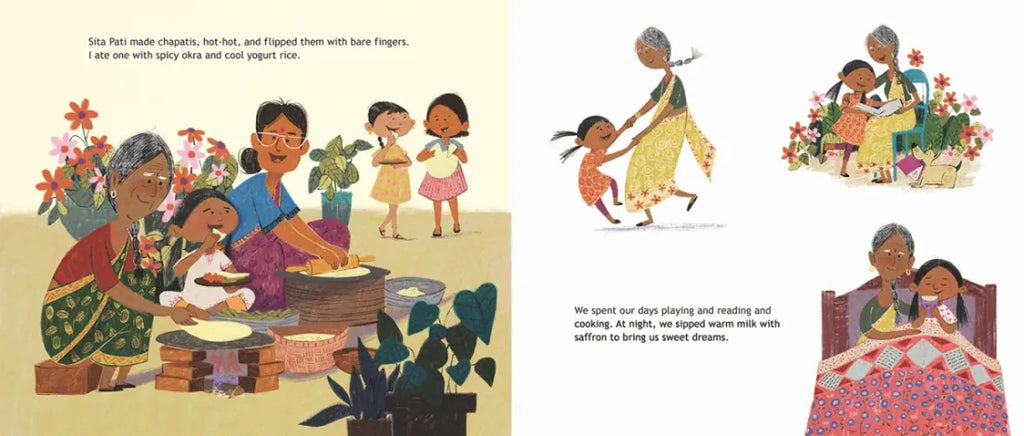 When Jyoti visits her grandmother halfway around the world, she is overwhelmed by the differences between India and home. At first she feels lonely and out of place, but soon, despite a language barrier, she and Sita Pati are able to understand each other. They form a bond – looking at books together, making designs with coloured sand, shopping at the market, playing games, eating chapatis and sipping warm milk with saffron to bring sweet dreams. When it’s time to part, Jyoti doesn’t want to leave, but then she remembers that in Tamil, people don’t say goodbye, they say “I’ll go and come back.” Sure enough, the two reunite the next summer when Pati visits Jyoti in America, and it’s Jyoti’s turn to make her grandmother feel welcome. Can they create some special memories that will last until the next time they see each other?