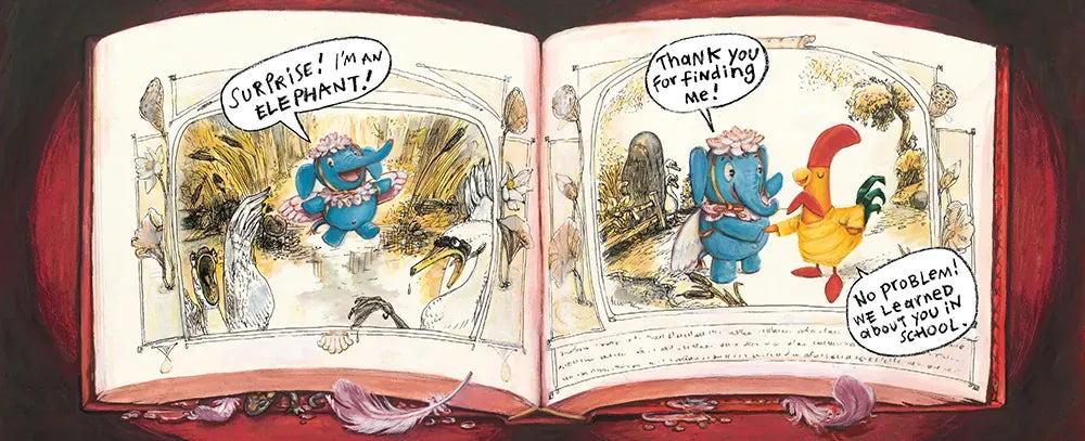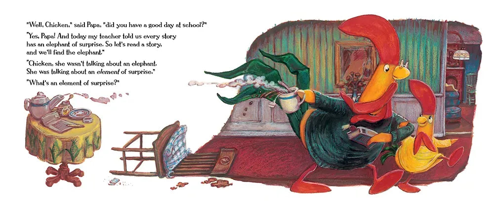 It’s homework time for the little red chicken, who has just learned about something every good story should have: an elephant of surprise. Or could it be an element of surprise (as her amused papa explains)? As they dive in to story after story, looking for the part that makes a reader say “Whoa! I didn’t know that was going to happen,” Papa is sure he can convince Chicken he’s right. After all, there are definitely no elephants in “The Ugly Duckling,” “Rapunzel,” or “The Little Mermaid” — or are there? Elephant or element, something unexpected awaits Papa in every story, but a surprise may be in store for the little red chicken as well. Full of the same boisterous charm that made Interrupting Chicken so beloved by readers, this gleeful follow-up is sure to delight fans of stories, surprises, and elephants alike.