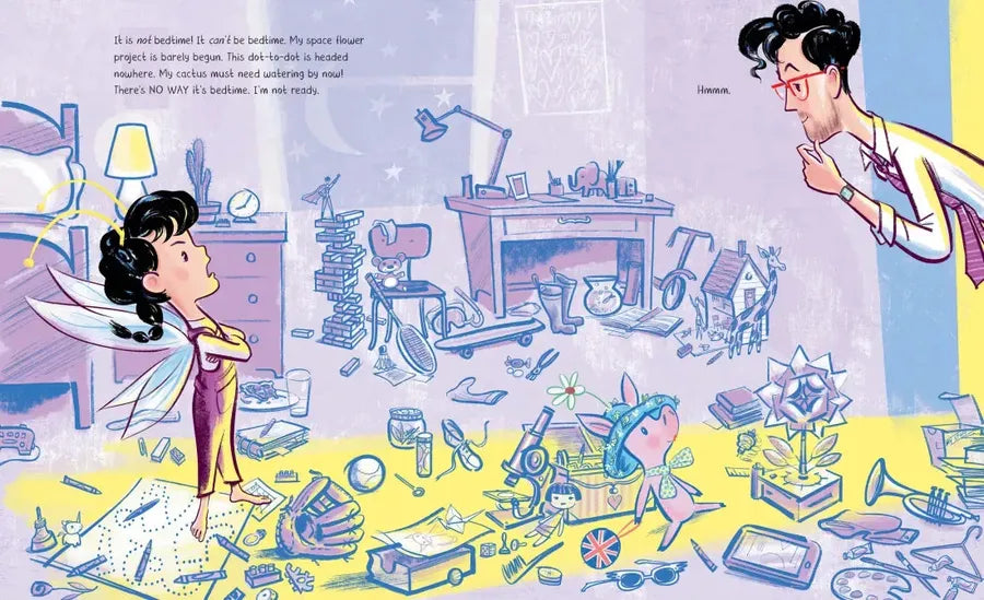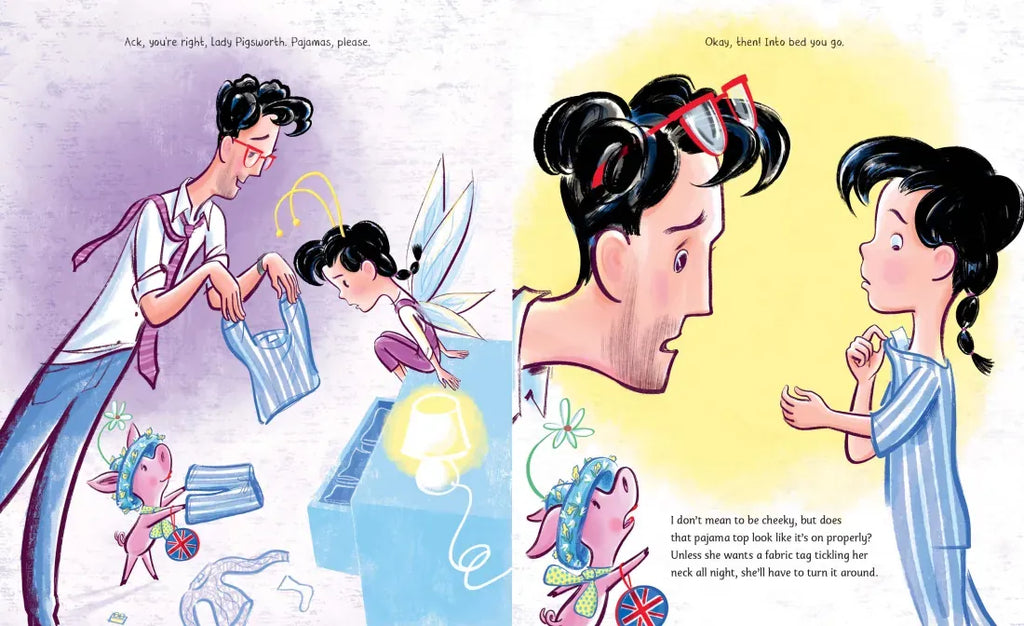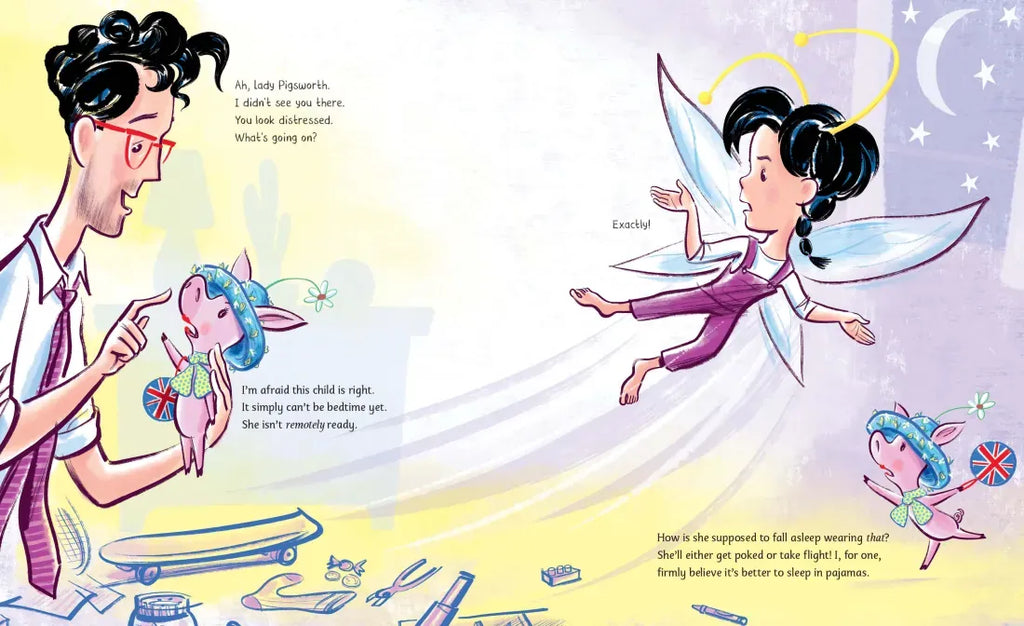 Lady Pigsworth is quick to point out the many ongoing projects that just can’t be abandoned, the danger of sleeping in a butterfly costume, the alarming spinach stuck in the girl's teeth, and more. Each over-the-top declaration of why it can’t possibly be bedtime yet leads the group through common bedtime routines in animated and heartwarming scenes—until Lady Pigsworth’s demands reach questionable heights, even to the little girl, so she takes matters into her own hands to get both of them into bed.