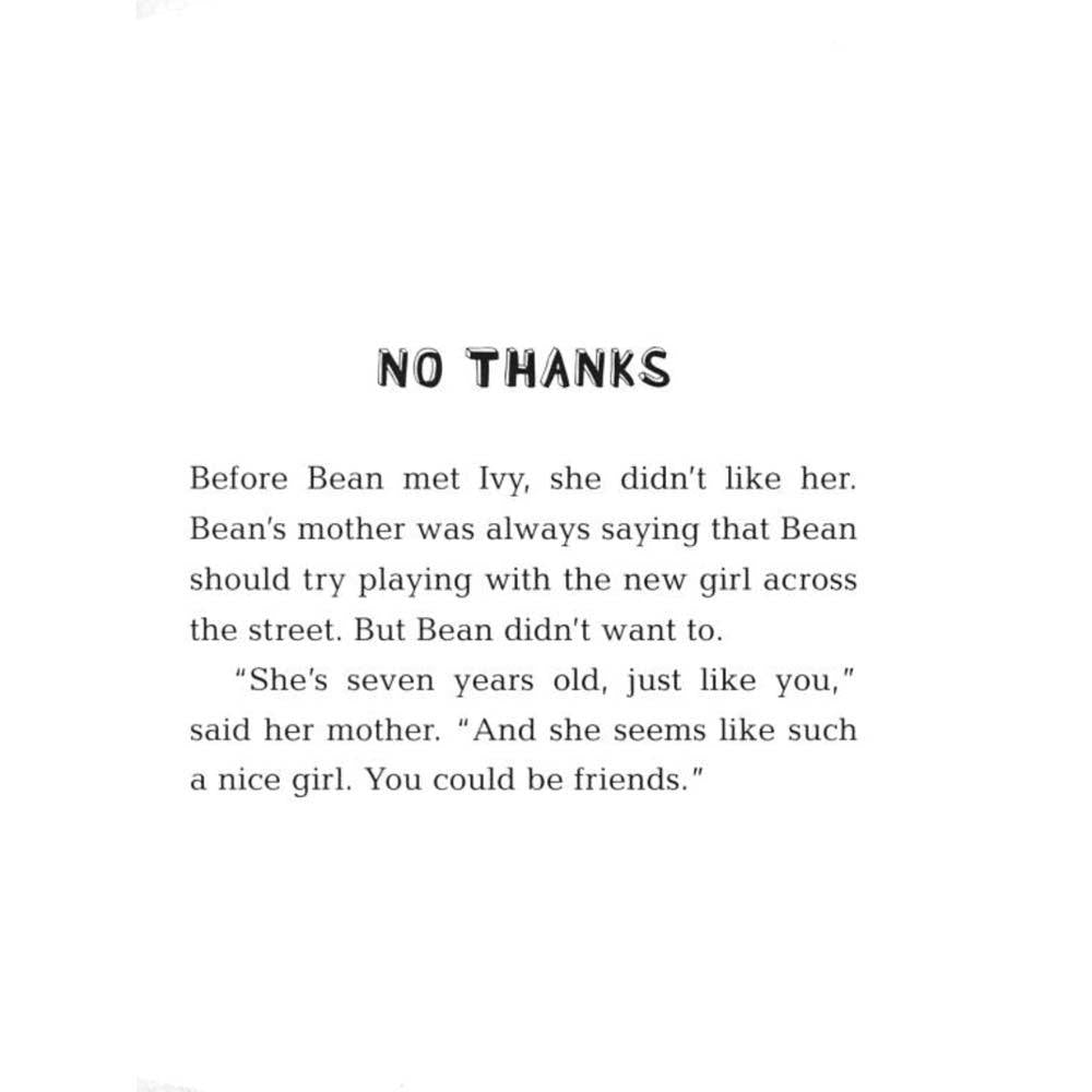 Meet Ivy and Bean, two friends who never meant to like each other: Ivy and Bean are very different. Bean is loud and wild and goofy. She loves to be involved in games and poke her nose in other people's business. Ivy is quiet and full of ideas. She spends most of her time learning how to be a witch. Each girl thinks the other one is weird. Each girl thinks she could never be friends with the other. But sometimes opposites can become the best of friends because they're opposites!