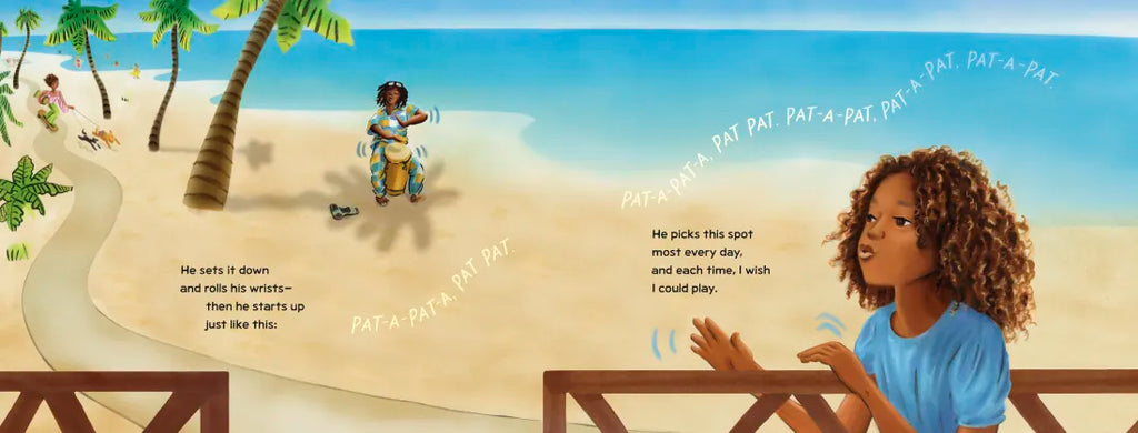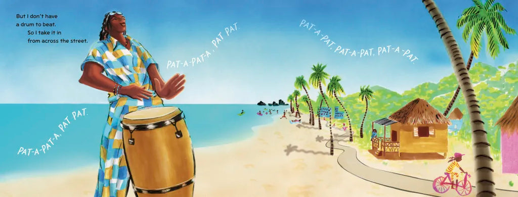 A drum circle is forming on the beach, and one fascinated child would love to join in. Soon there’s everything from a conga’s pat-a-pat-a, pat pat to some bongos’ taka taka, ta ta—and it looks like so much fun! But what do you do when you don’t have a drum? Well, when you let the music move you, you just might find other ways to jam, too!