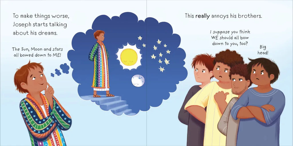 When Joseph's father gives him a brightly decorated coat, his brothers are green with envy. But kindly Joseph forgives their jealousy, in this delightful retelling of the much-loved Bible tale.