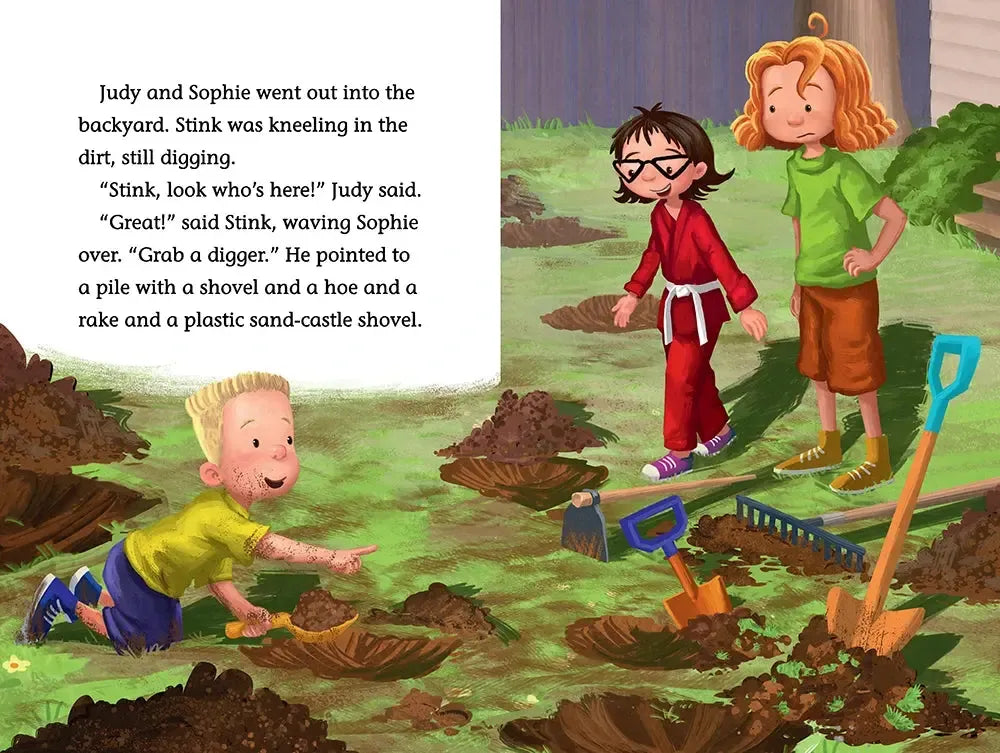 Surprises are in store as Stink excavates his backyard in search of a relic from an extinct beast — and Judy lends him a little sleight of hand.