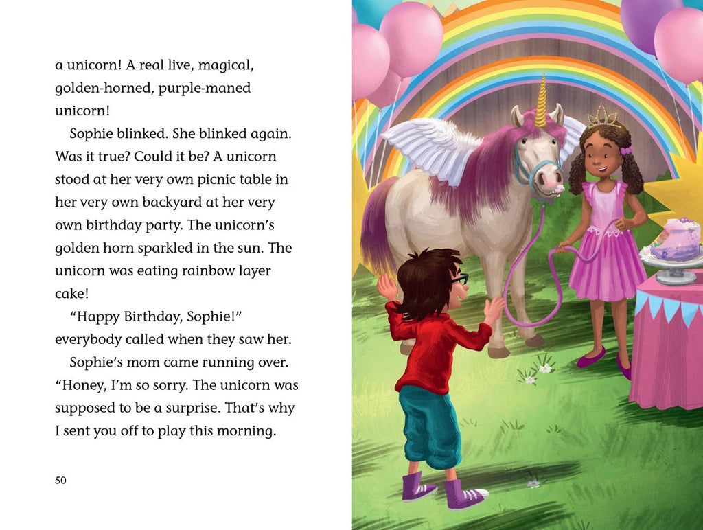 Unless Sophie’s eyes are playing tricks on her, a real live unicorn is on the loose! In her town! Sophie knows that if you touch a unicorn, you’ll be happy forever. She also knows that unicorns have healing powers and can poop rainbows. Sophie needs that unicorn! But unicorns are almost impossible to catch. Can her friend Stink, her faith in magic, and a bunch of carrots help make Sophie’s wildest birthday wish come true?