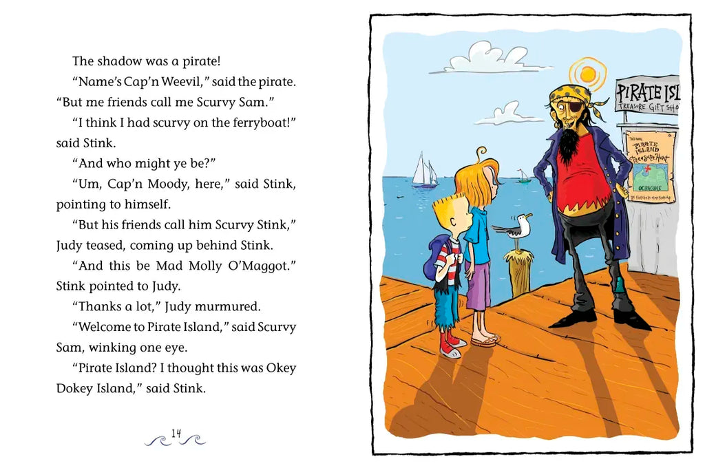 As soon as the Moody family drops anchor on "Artichoke" Island, they are greeted by Cap’n Weevil, a one-eyed buccaneer with a scraggly beard and a secret treasure map. Before you can say "Davy Jones’s Locker," Stink and Judy are racing across the island in search of gold. But—shiver me timbers!—they’re not the only salty dogs lookin’ for loot. Can Mad Molly O’Maggot and Scurvy Stink beat out their rivals, Tall Boy and Smart Girl? Can they find the hidden clues, crack the secret codes, and solve the tricky puzzles before time runs out? Aaarrr!