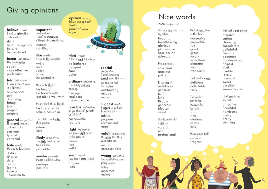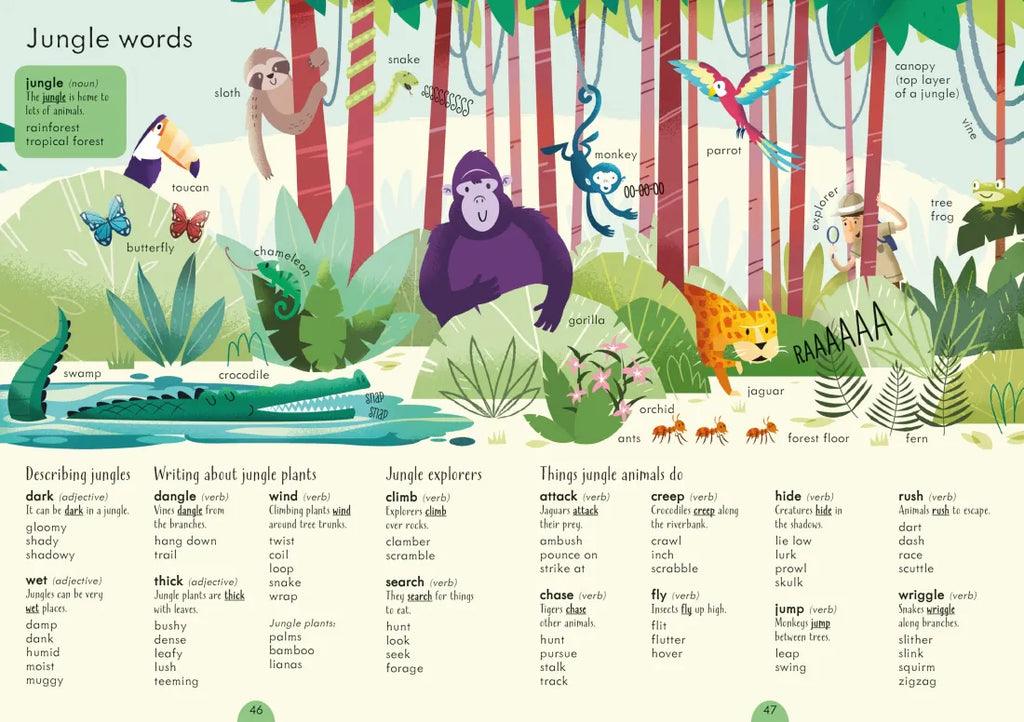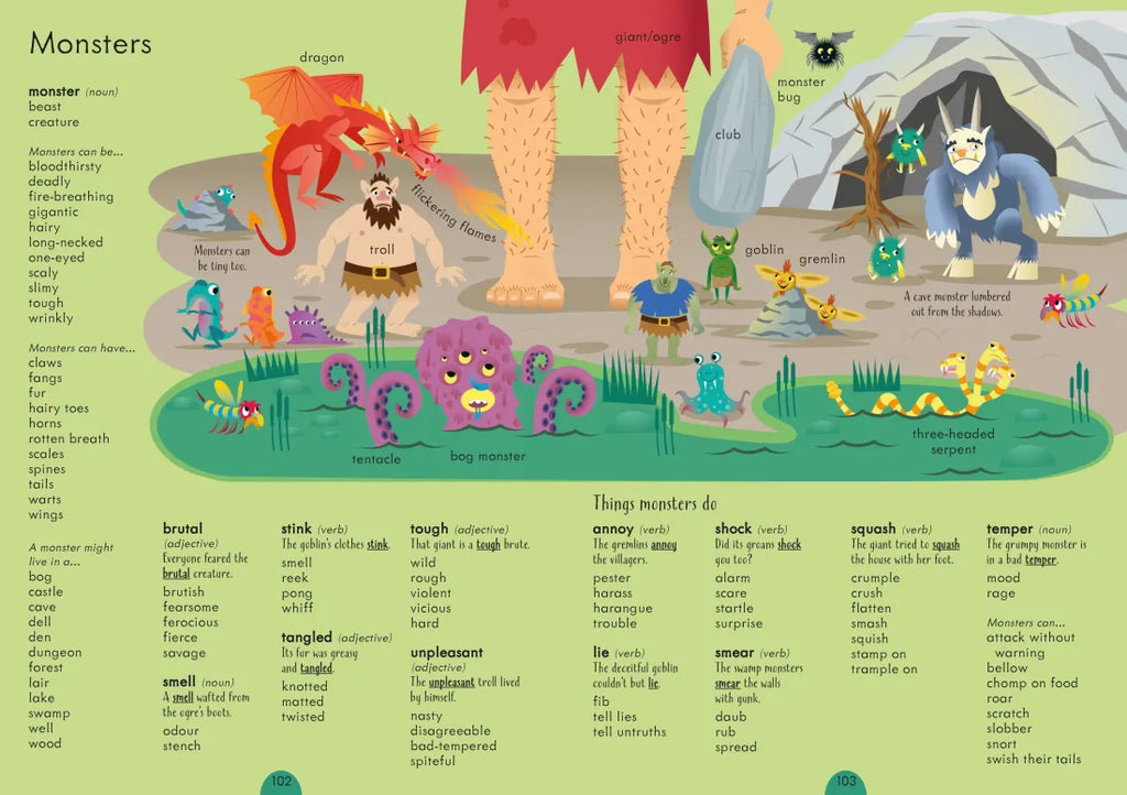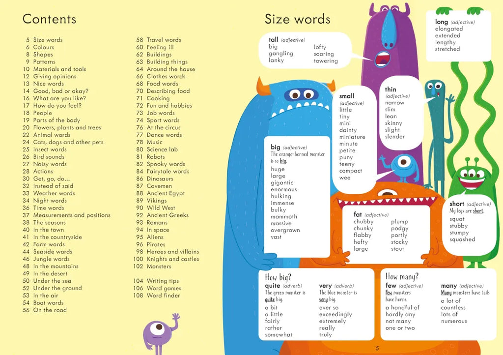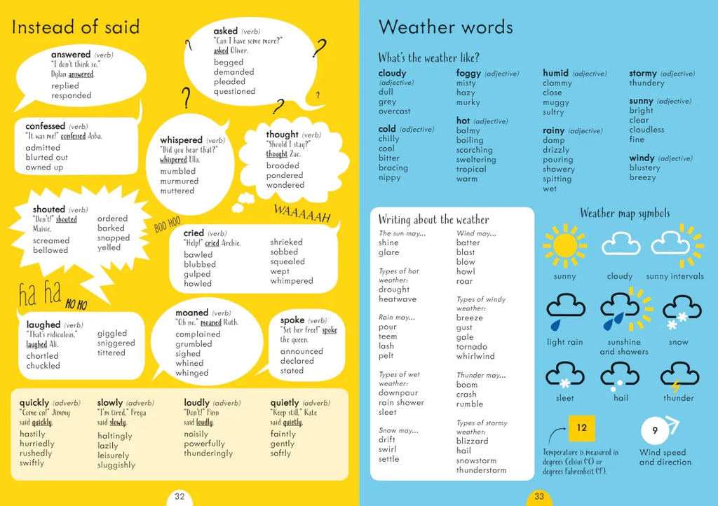A fantastic resource to help children boost their word power, both when writing and talking. Words and their synonyms are grouped in over 90 topics, including for example, animal words, noisy words, fairytale words, jobs, sports, monsters, weather and lots more. Children can choose a topic relevant for their story, or look for a word in the Word Finder index. Colourful pictures illustrate many of the word meanings, and there are writing tips, word games and internet links to other carefully chosen writing resources online.