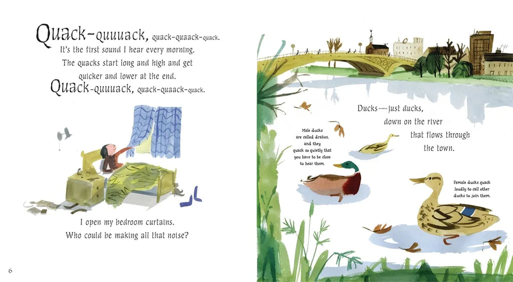 The young girl in this story may live in the city, but outside her window there’s a river full of mallard ducks! She hears them as soon as she wakes up, and on the way to school she sees them upside down bobbing for food. Interspersed with fun facts, her enthusiastic commentary about her feathered neighbors — what they look like, how they behave, where they nest, where they sleep — pairs swimmingly with cheerful watercolor illustrations.