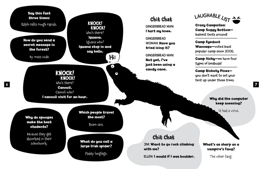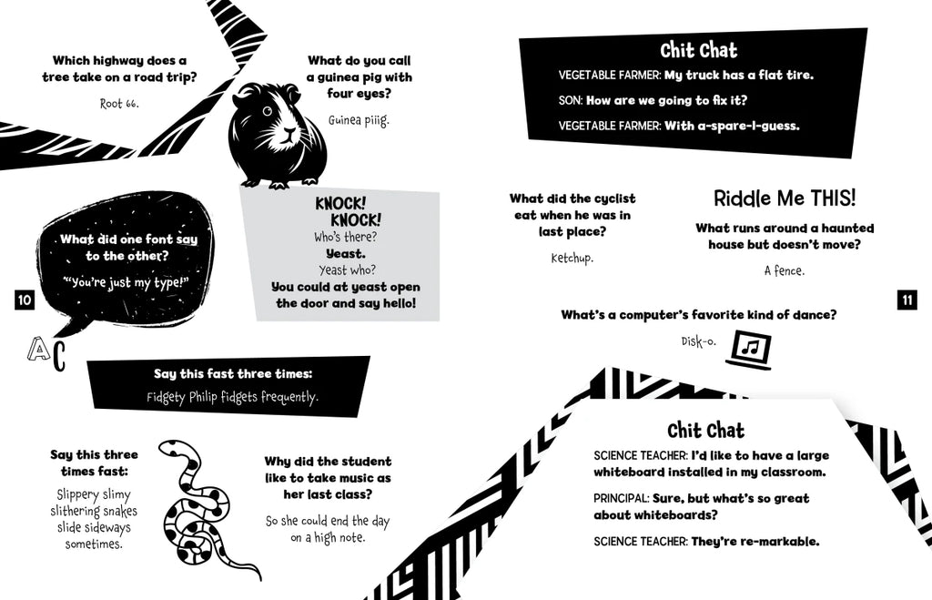 This gut-busting book is packed with all kinds of jokes kids love—the wackier and cornier the better! Zany animal illustrations bring the jokes to life, with fun drawings of roaring dinos and quirky critters sprinkled throughout the book. Just Jokes: 591½ Rib-Tickling Riddles, Knee-Slapping Knock-Knocks, and Tricky Tongue Twisters for Kids! is as silly as the name suggests and is the perfect size for throwing in a backpack or taking on a road trip—guaranteeing tons of giggles, anytime and anywhere!
