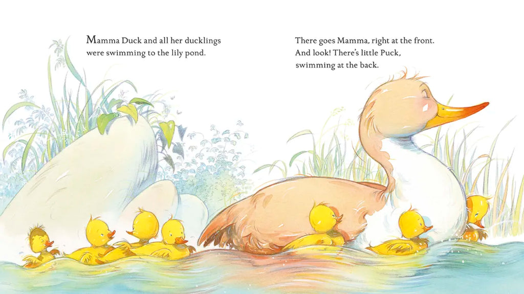 Mamma Duck and her ducklings are paddling to the pond. But the littlest duck, Puck, keeps falling behind… “Keep up, Duck!” his mama quacks. But Puck is determined. Even if he can’t swim very fast, he WILL find a way to keep up!