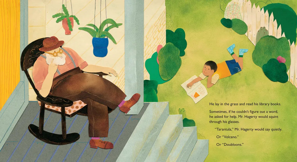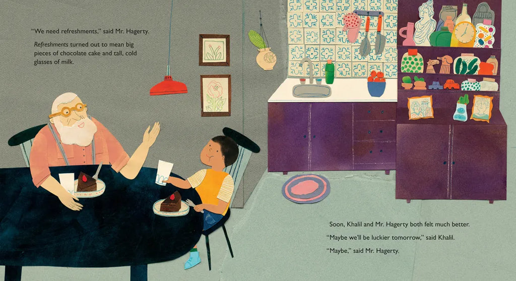 Khalil lives in the upstairs apartment with his family, which is big and busy and noisy. Downstairs lives Mr. Hagerty, who is quiet. Khalil and Mr. Hagerty don’t appear to have a lot in common, but hot summer days have a way of bringing people together. As Khalil looks for buried treasure in the yard, Mr. Hagerty tends to his garden. Both help each other navigate language — whether it be learning new words or remembering those seemingly forgotten. Before long, an unlikely friendship is born, full of treasure, thoughtfulness, and chocolate cake. Through well-cultivated details and vibrant cut-paper collage, author Tricia Springstubb and illustrator Elaheh Taherian nurture a heart-tugging tribute to the love of good neighbors and to the strength of intergenerational and intercultural bonds.