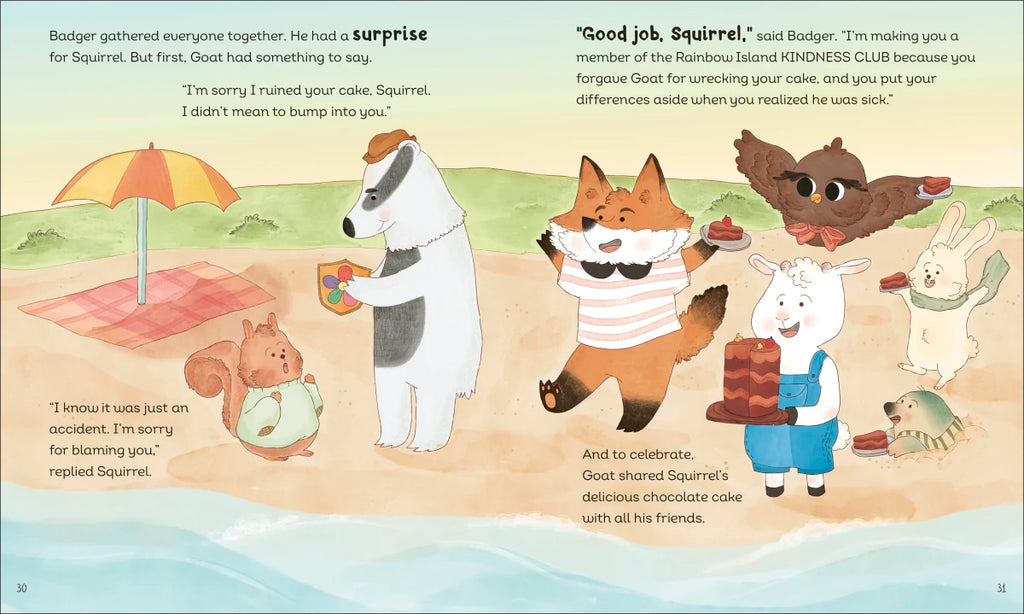 Rainbow Island is having a baking competition! Squirrel sets off with his famous chocolate cake, but when Goat crashes into him, the cake goes flying. Squirrel is inconsolable. However, he later finds out that it was an accident. Will Squirrel learn to forgive Goat's actions? Will Goat accept Squirrel's kindness?