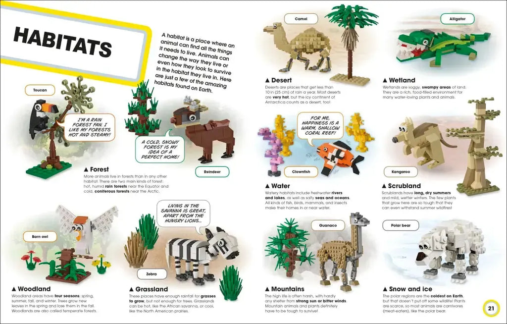 It is packed with fascinating animal facts, images, and building ideas for more than 100 models of the world's coolest animals. The maps are followed by colorful spreads featuring up to seven LEGO animals in their natural habitats.