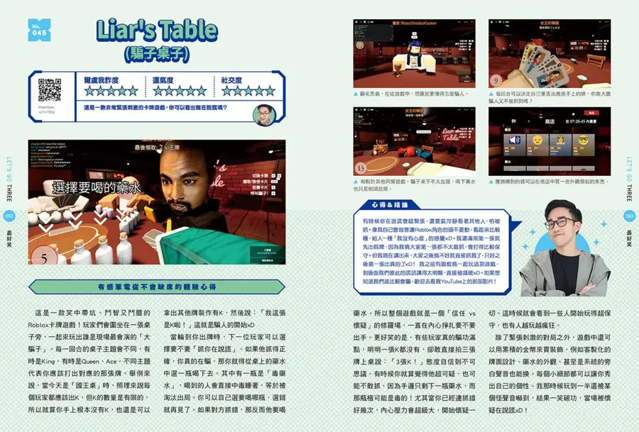 身為Roblox中文圈的第一位百萬訂閱級YouTuber,有感筆電憑藉多年實況經驗與獨到的遊戲品味,這次再度親自出馬,費時超多的時間與心血,精選出120款風格各異的Roblox遊戲,並依照不同主題,將遊戲區分為:最熱門、最極限、最好笑、最驚悚、最神、最雷、最chill、最sus、最U質、最感人勵志等十大類,每一款都收錄筆電的真實心得、爆笑片段,以及驚呼不已的關卡經歷與腦洞大開的神級操作。從新手到老手、從熱血到療癒、從被嚇到跳起來到笑到打結,都能在這本《Let‘s Go!有感筆電從不會缺席的Roblox120款最極限遊戲》中一次獲得滿足!