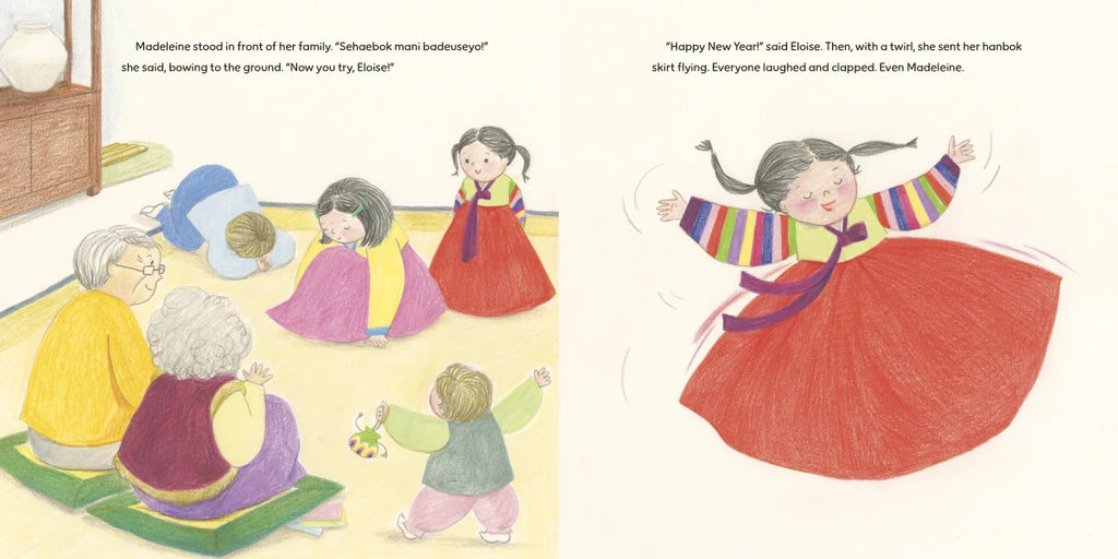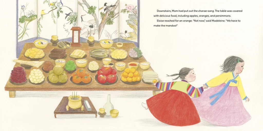 Madeleine and Eloise are getting ready for their family's Lunar New Year party, and there's so much to do before the guests arrive! From putting on colorful outfits called hanboks and making Korean dumplings called mandoo, to setting up yutnori, a traditional board game, Madeleine shows her younger sister how to prepare for the holiday. But when Madeleine forgets to write a poem to share with the family, Eloise offers to help—and the girls realize that although each tradition is special, what matters most is spending the day together.