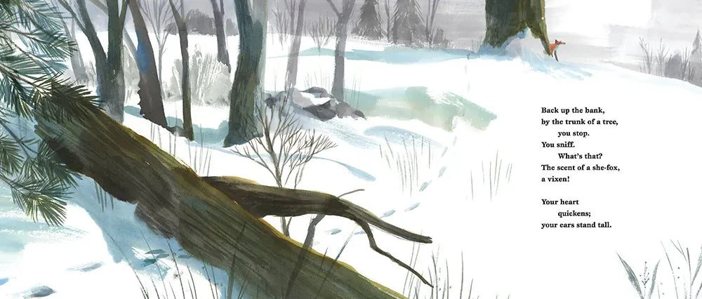 A red fox emerges from its burrow one wintry morning, a fiery streak against stark white surroundings, driven by hunger and curiosity to investigate its world. Encountering a mouse, a hare, and a wolverine, the little fox takes on the role of both hunter and hunted before returning to the safety of its den, where — perhaps — it dreams of something more. Jonathan London’s poetic text and Daniel Miyares’s stunning impressionistic paintings provide an evocative portrait of a fox and its place in the natural world.