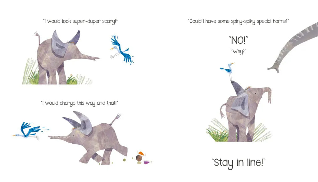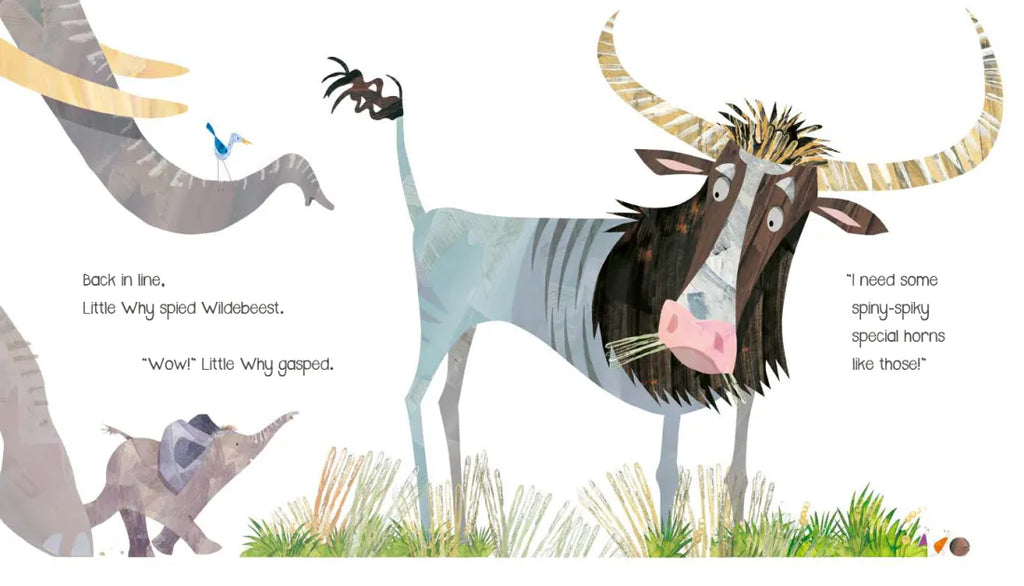 Little Why just cannot seem to stay in line with the other elephants. There's just too much to see; Giraffe's long-lofty leggy legs, Wildebeest's spiny-spiky horns, and even Crocodile's snippy-snappy teeth! Look out, Little Why!