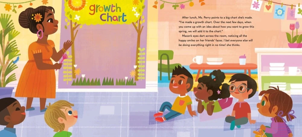 But Mason's favorite teacher Ms. Perry has an idea... a growth chart! It’s not like other growth charts that measure how tall children grow, it’s a place for students to put how they each want to change and grow over the next few months. Sure, some students want to get taller, but others have different goals. Reynaldo wants to learn the sound of every letter in the alphabet, Irene wants to learn how to ride a bike without training wheels, and Mason, well Mason wants to grow in every way!