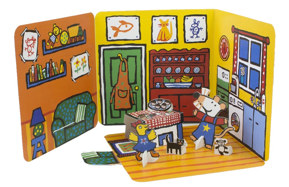 Maisy’s fans are invited to join the friendly mouse as she goes through her daily routines: getting up in the morning, making breakfast in the kitchen, painting a picture, and having afternoon tea with Tallulah. Then it’s time for little listeners to put their imaginations to work with the help of a pop-up play set of Maisy’s house with four removable characters — Maisy, Little Black Cat, Panda, and Tallulah. Who wants to meet in the kitchen for tea and cookies?