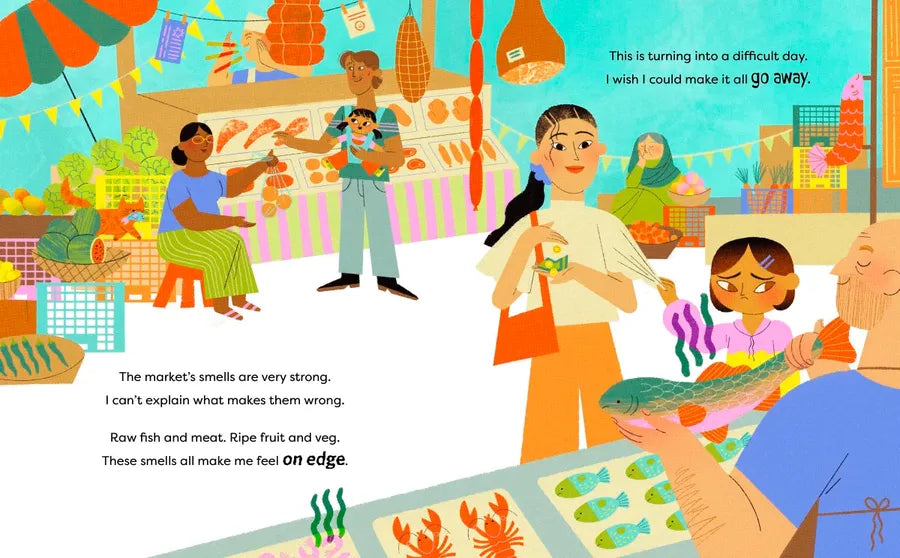 The market is SO SMELLY, the bathrooms are SO LOUD, the food is always SO MUSHY, and the lights are SO BRIGHT. What was supposed to be fun is actually making her feel . . . stressed out. Can she block out the things that bother her and end her day in a calmer place?