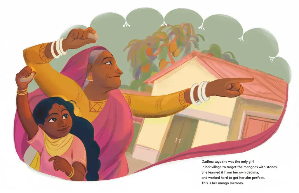 Her brother shares a memory about his first time mango picking: his father holding him steady as he reached high above for the fruit. But when the girl climbs the tree, she becomes too dizzy. Then her grandma shares a mango memory: learning, many years ago, to toss a stone that knocked the fruit from the branches. But when the girl throws her stone, she keeps missing.