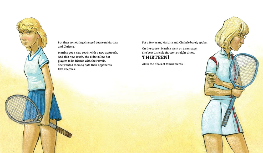 Martina Navratilova and Chris Evert come from completely different places and play tennis in completely different ways. Chrissie is the all-American girl: practiced, poised, with perfect technique. Martina hails from Czechoslovakia, a Communist country, and her game is ruled by emotion. Everything about them is different, except one thing: they both want to be the best. But as their intense rivalry grows, something else begins to swing into place, and a friendship forms that will outlast all their tennis victories. Phil Bildner and Brett Helquist tell the engaging true story of these two masters of the court as they win title after title — and, most importantly, the hearts of the fans.
