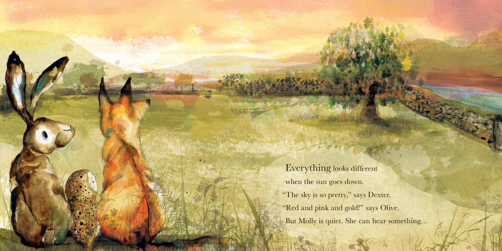 Molly the hare, Olive the owl, and Dexter the fox love to watch the sun set in the garden. But as night falls, they notice strange shapes in the shadows and hear strange rustlings in their beloved oak tree. What could it be? The more they look and listen, the more they wonder and worry. But is there really anything to worry about? Here is the fourth story about three animal friends that explores big emotional themes with gentle humor and gorgeous artwork perfectly pitched for toddlers!
