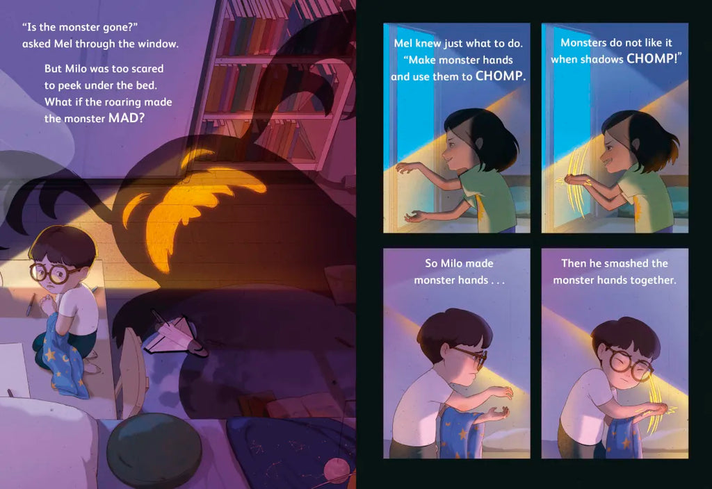 When nighttime comes, Milo has a problem—he’s convinced there’s a monster under his bed! Luckily, his best friend Mel knows just what to do—scare the monster more than the monster scares you! So using shadow puppets on the wall, Mel and Milo make monster hands that roar, chomp and even laugh to scare the monster away. But uh oh! What if the monster thinks this is funny! This is NOT funny! Milo has an idea to show the monster who’s boss once and for all. Together Milo and Mel hatch a plan to scare the monster away forever. But in the end, they discover the true cure to a monster problem is a best friend who will stand and face it with you.