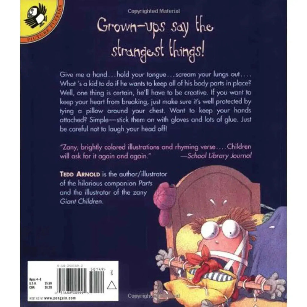 Give me a hand . . . hold your tongue . . . scream your lungs out . . . what's a kid to do if he wants to keep all his body parts in place? Well, one thing is for sure, he'll have to be creative. Like, if you want to keep your heart from breaking, just make sure it's well padded and protected by tying a pillow around your chest. Want to keep your hands attached? Simple-stick them on with gloves and lots of glue. Just be careful not to laugh your head off!